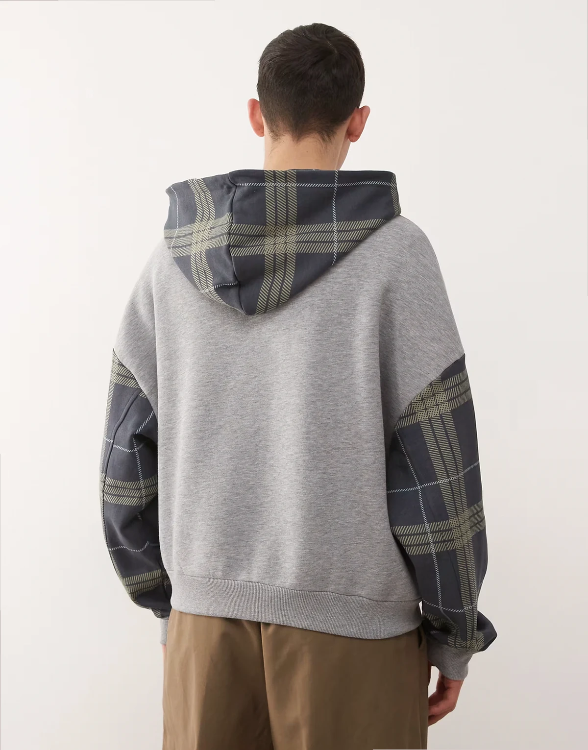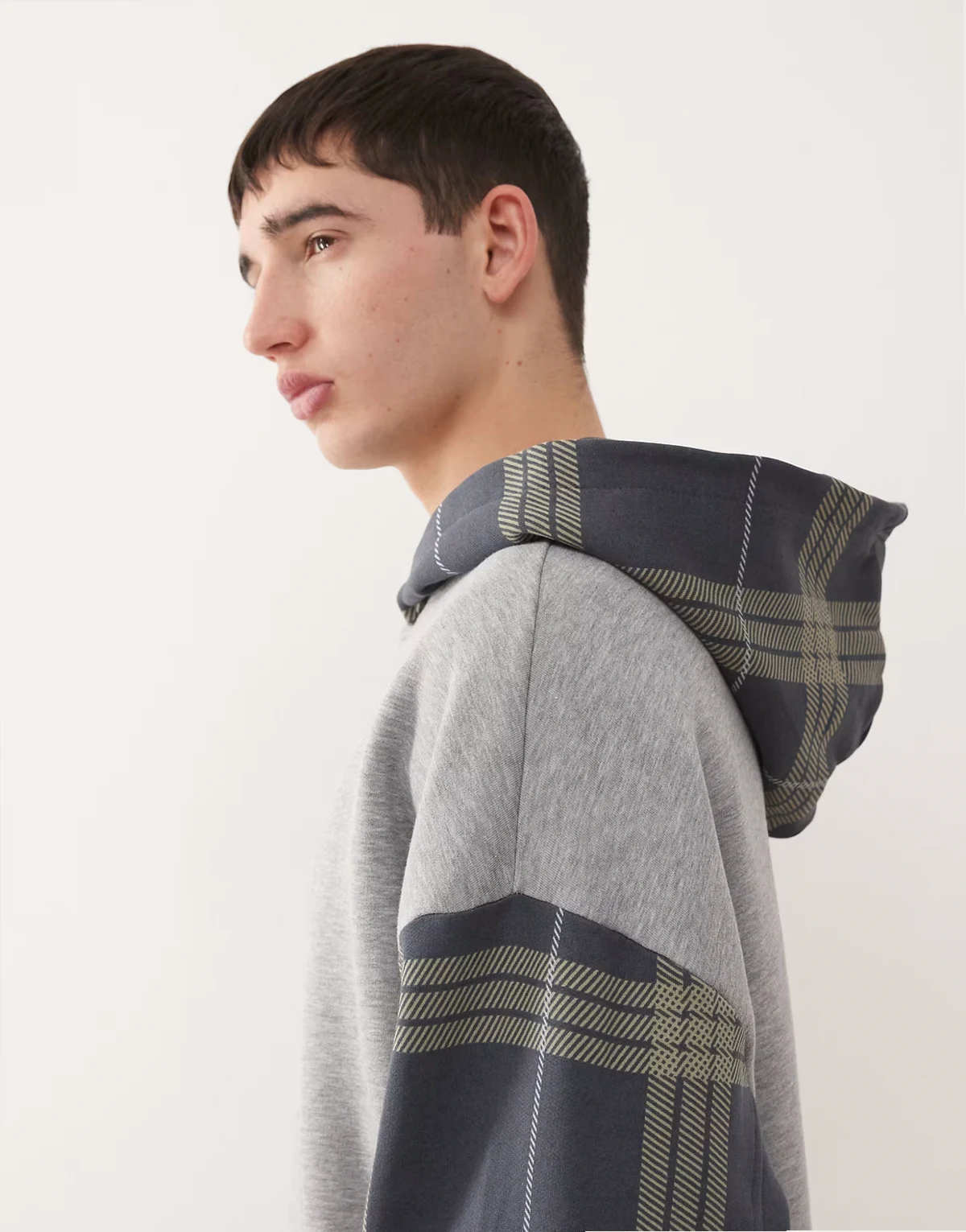 – Kastenförmiger Kapuzenpullover in Grau mit karierten Ärmeln im Bahnendesign