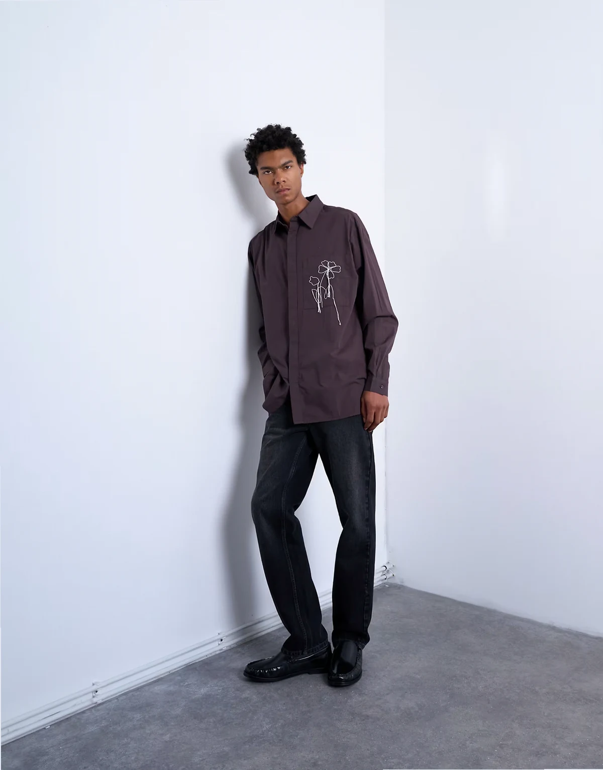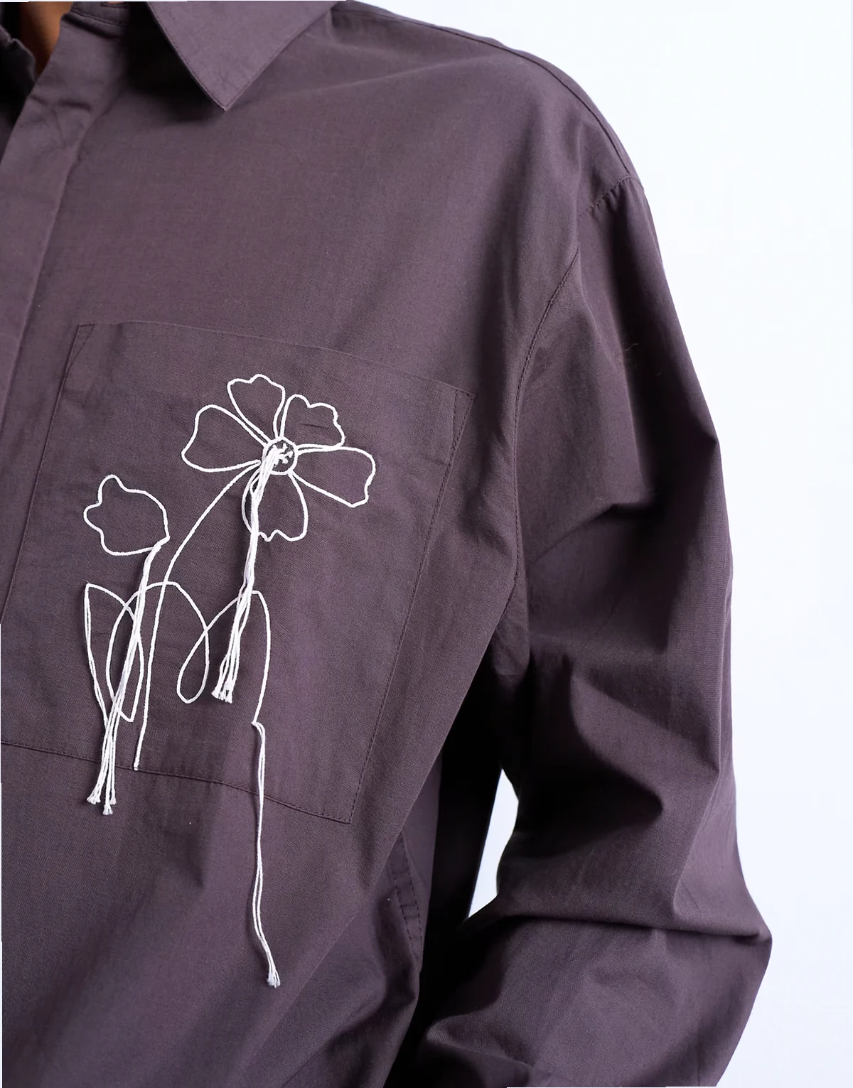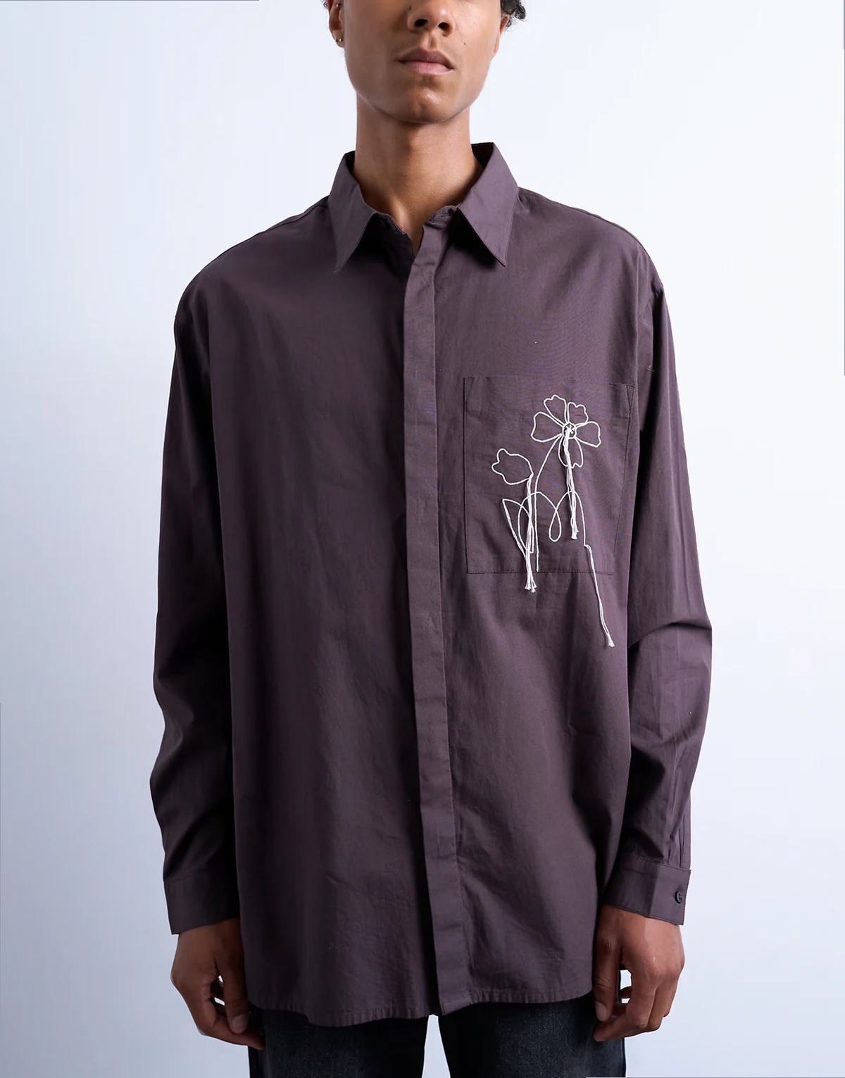 Dieses Hemd ist aus festem Popeline-Stoff gefertigt – mit breitem Kragen, verdeckter Knopfleiste, überschnittenen Schultern, Brusttasche mit Blumenstickerei und Oversize-Schnitt.