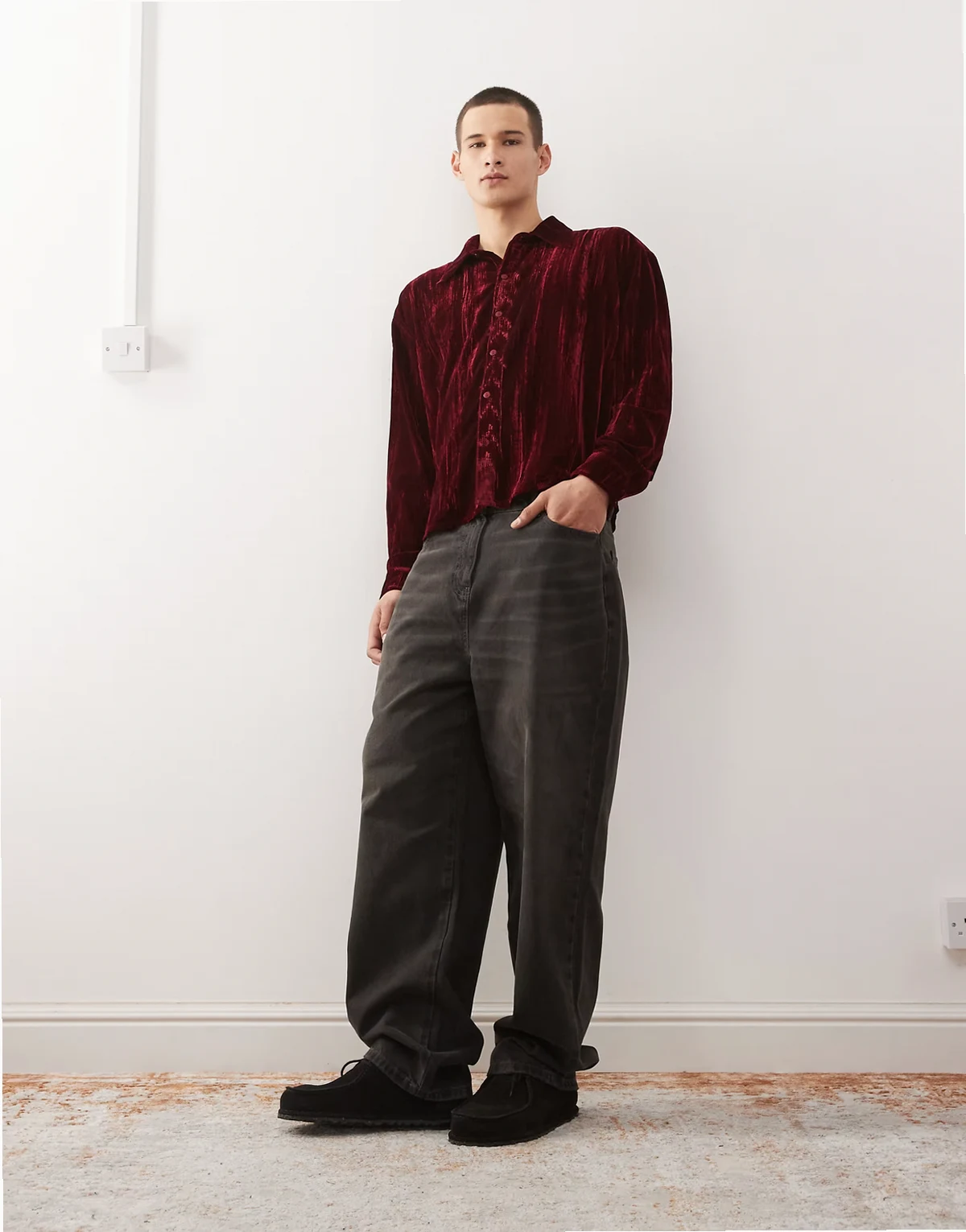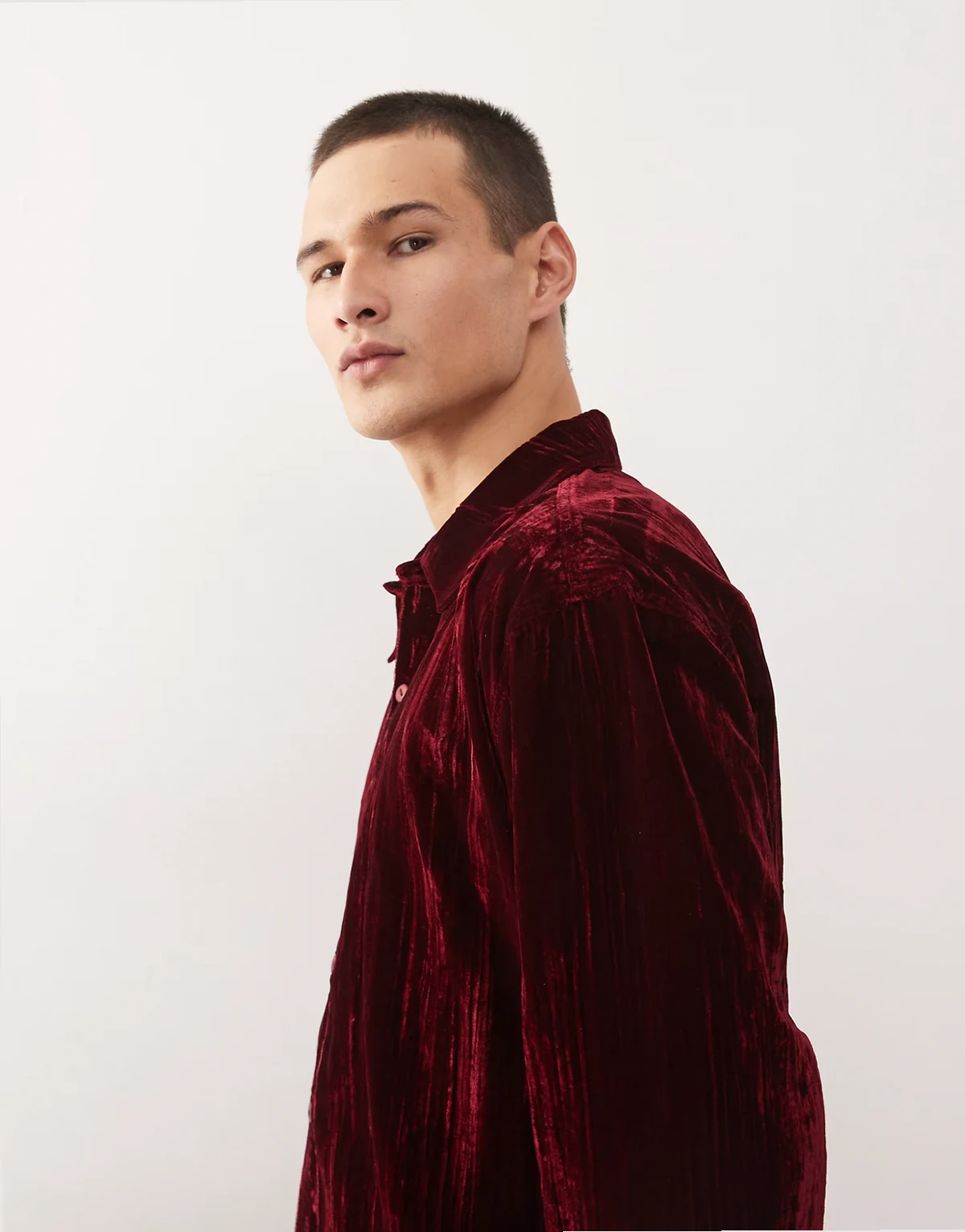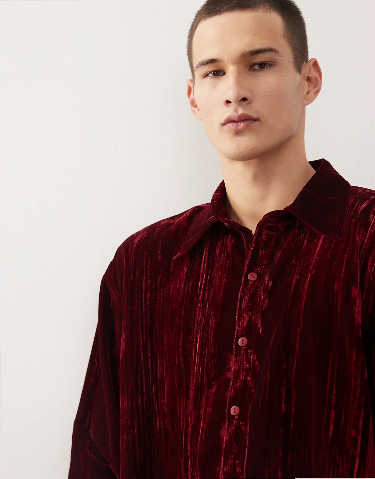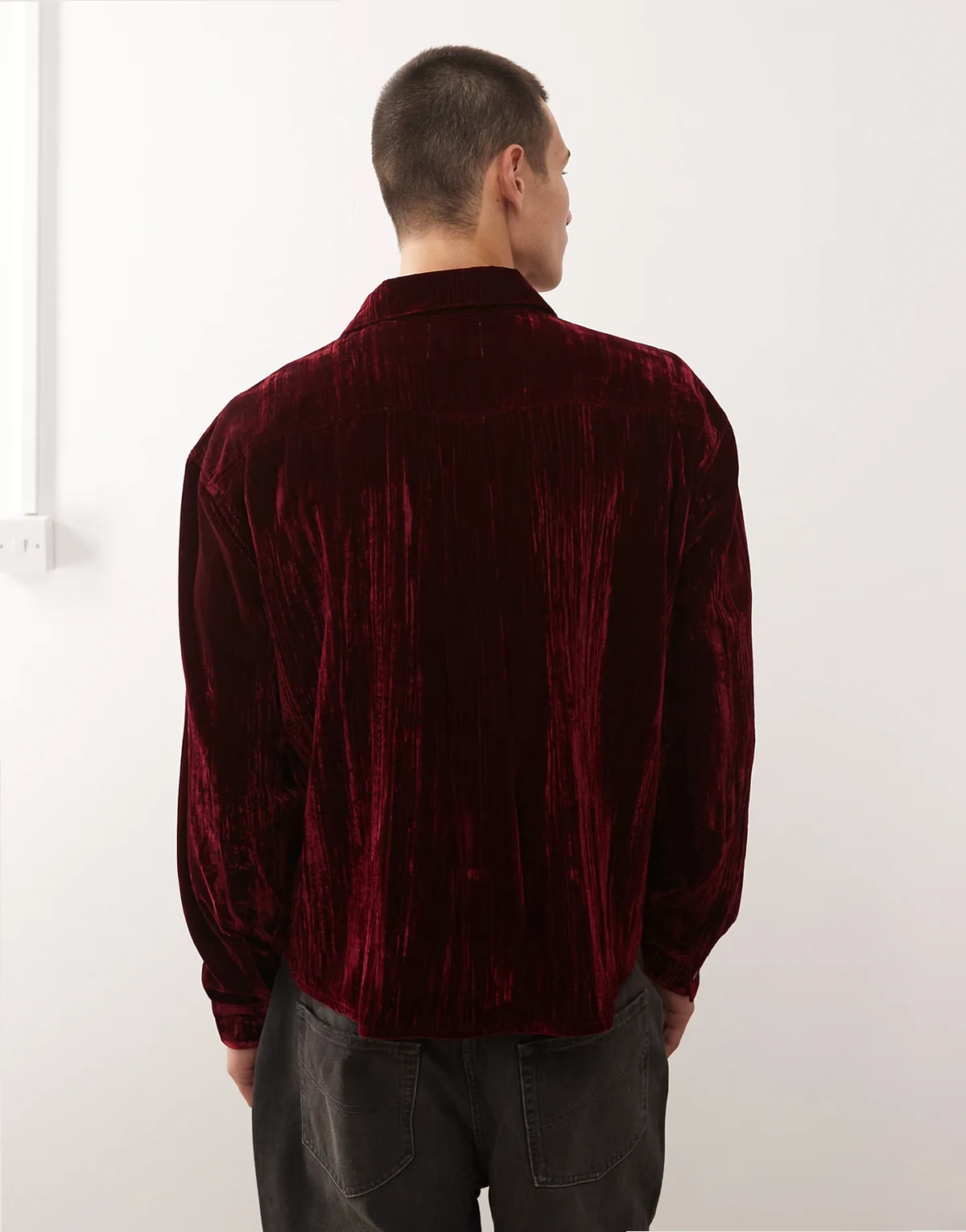 – Kastiges Cropped-Hemd aus Samt in Burgunderrot