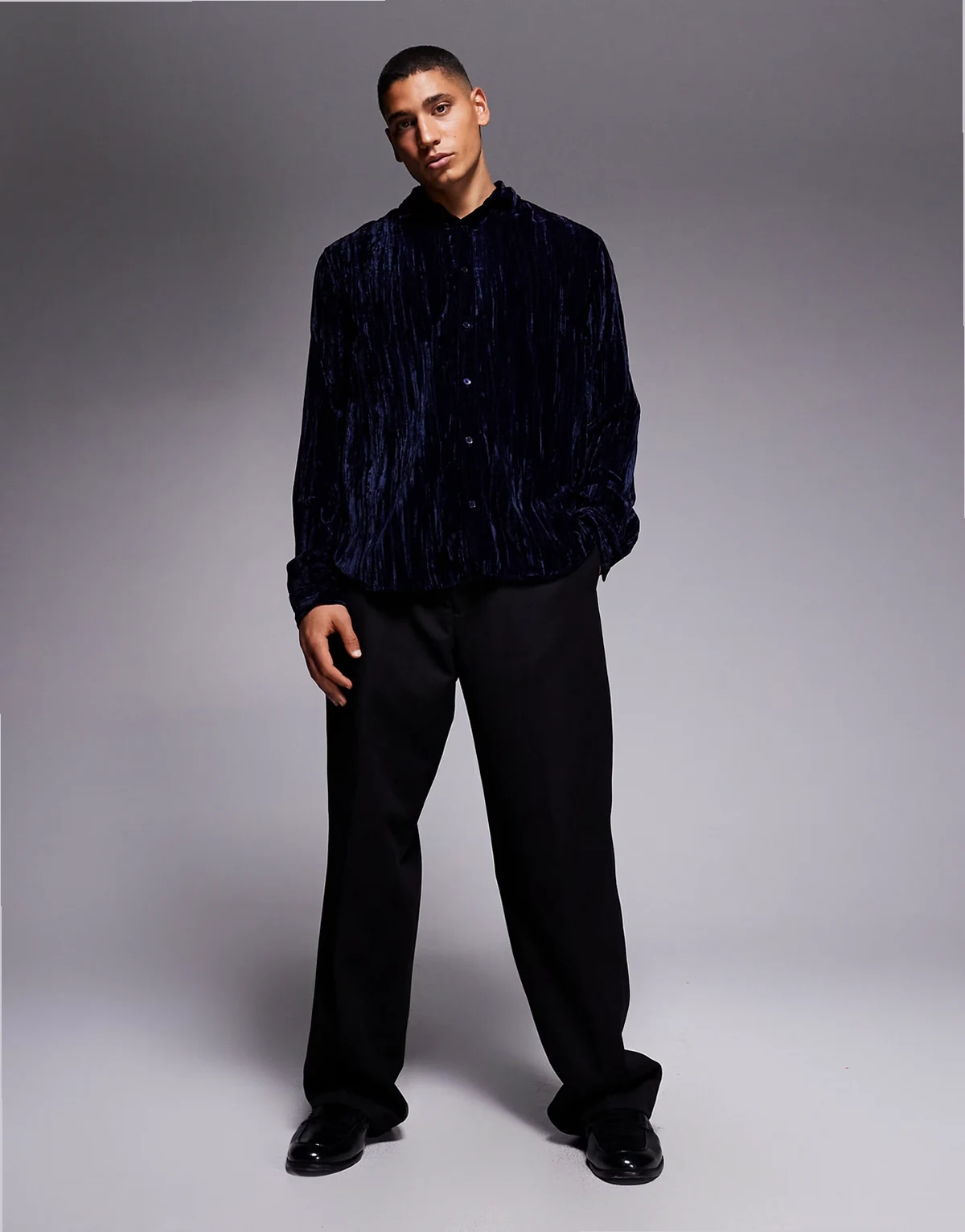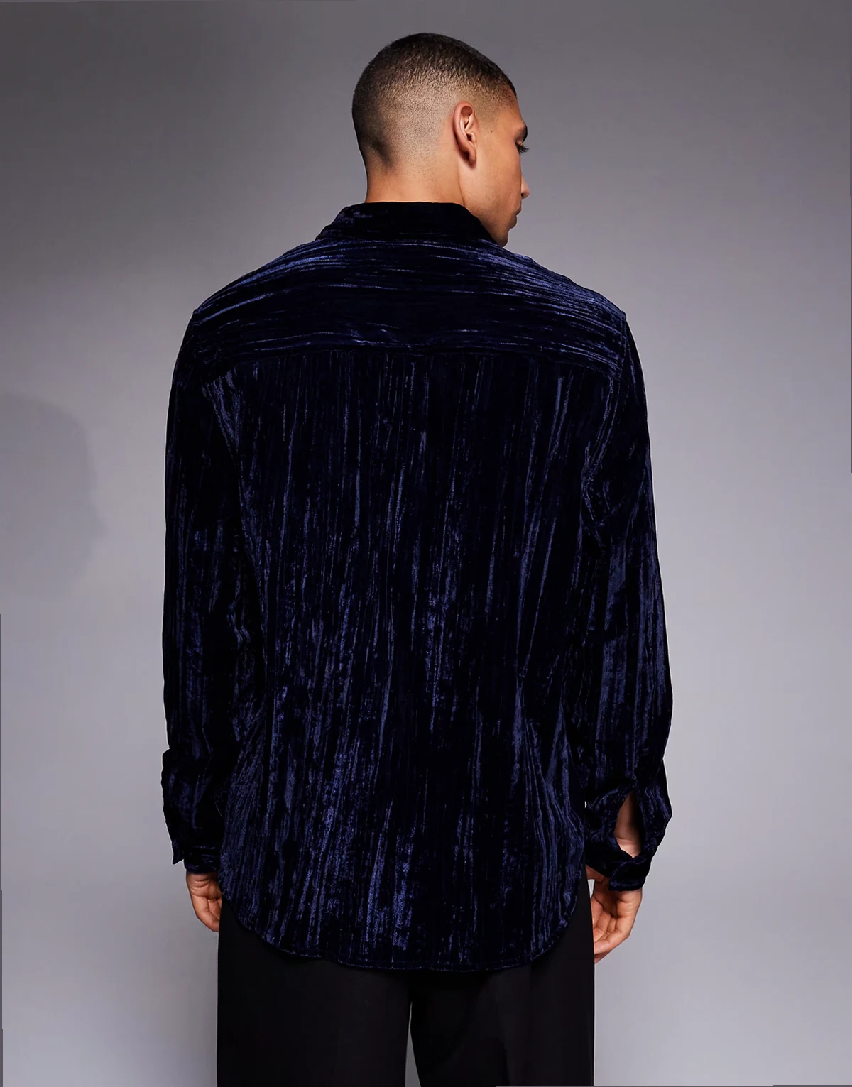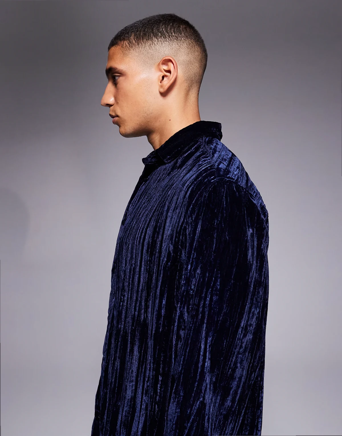 – Samthemd in Marineblau mit lockerem Schnitt und Knitterstruktur
