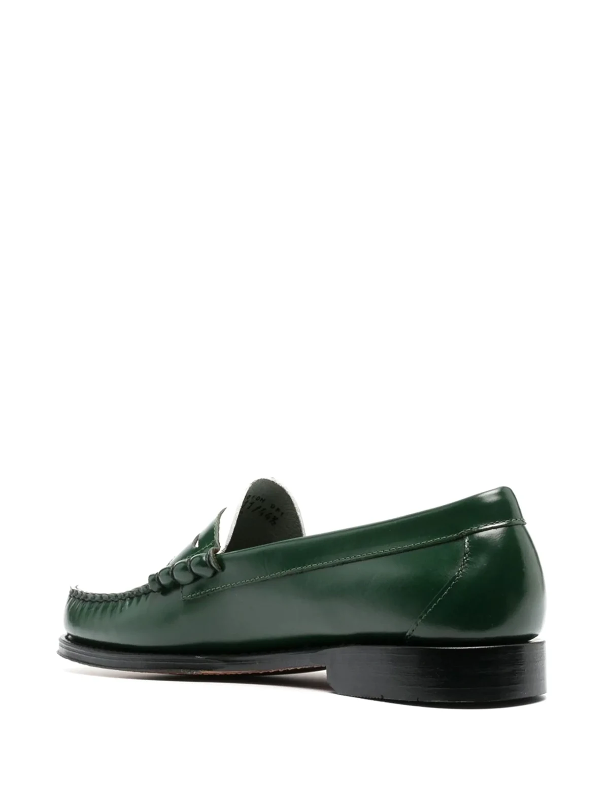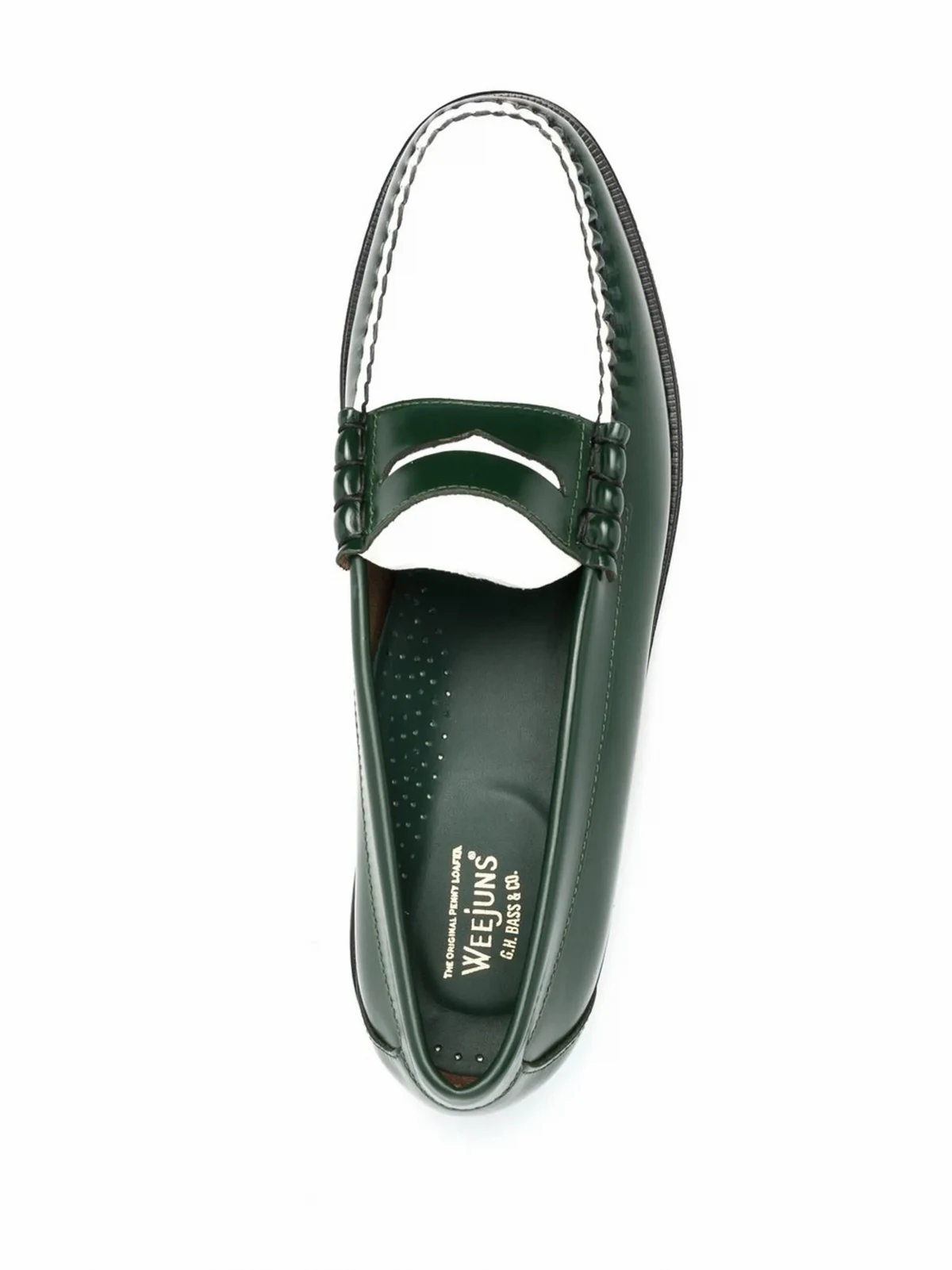 Kalbsleder, Kontrastnähte, Penny-Riemen, zweifarbig, runde Kappe, ohne Verschluss, flache Gummisohle.