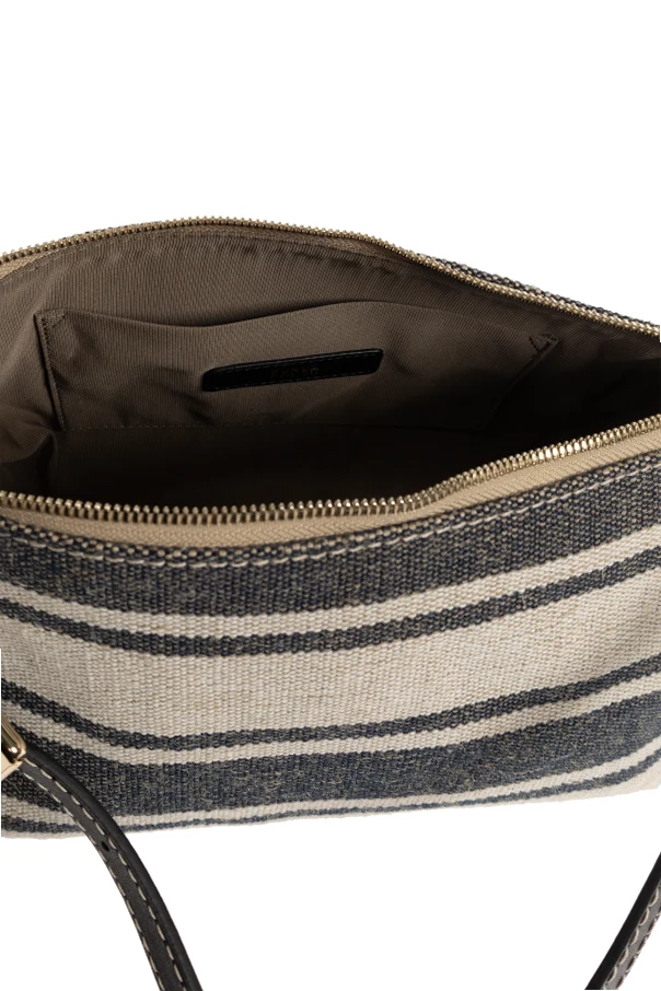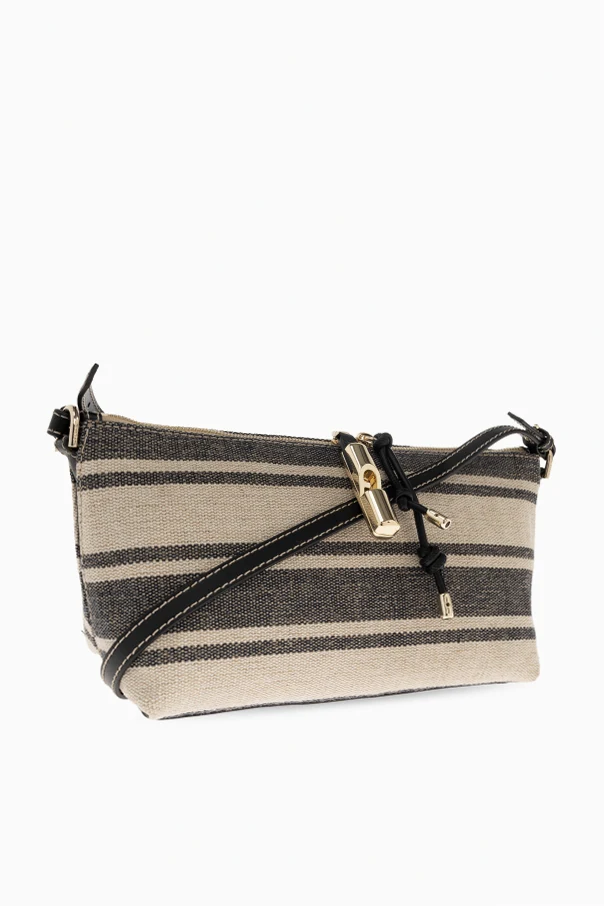 Das Modell zeichnet sich durch breite, horizontale Streifen in tiefem Schwarz aus, die majestätisch mit dem cremefarbenen Hintergrund kontrastieren. Ergänzt wird das Gesamtbild durch ein luxuriöses goldenes Detail am Reißverschluss – einen dekorativen, kunstvoll signierten Karabiner, der dezent das Prestige der Marke Furla unterstreicht. Schwarze Ledereinfassungen und ein Schulterriemen in Schwarz vollenden das Design, sorgen für außergewöhnliche Haltbarkeit und einen unverwechselbaren Stil.