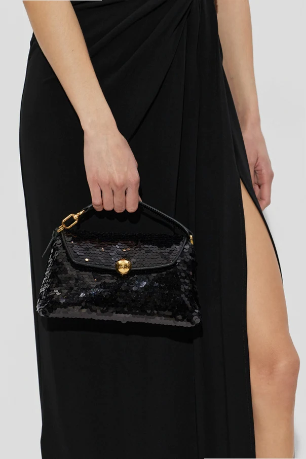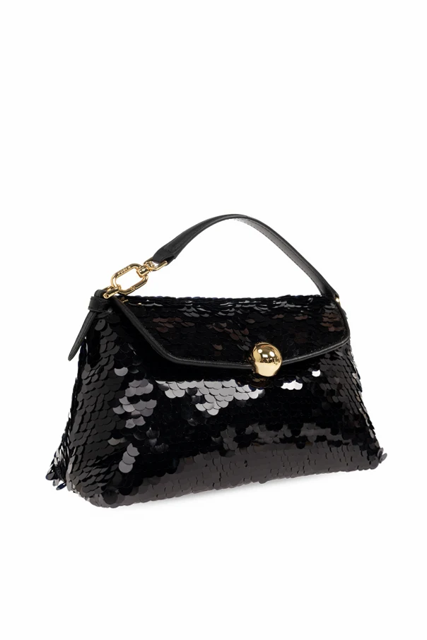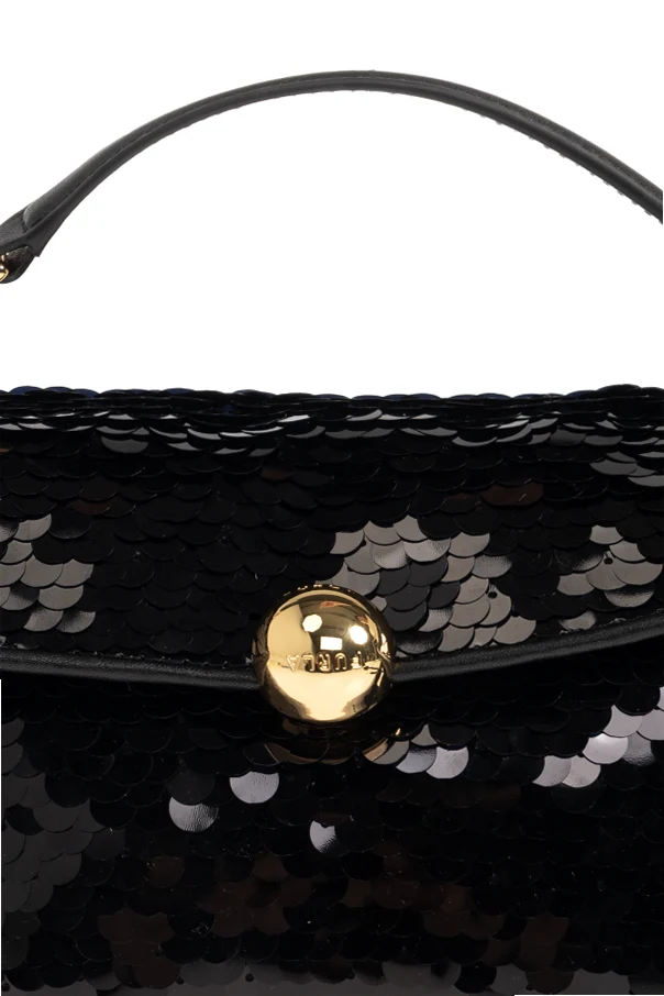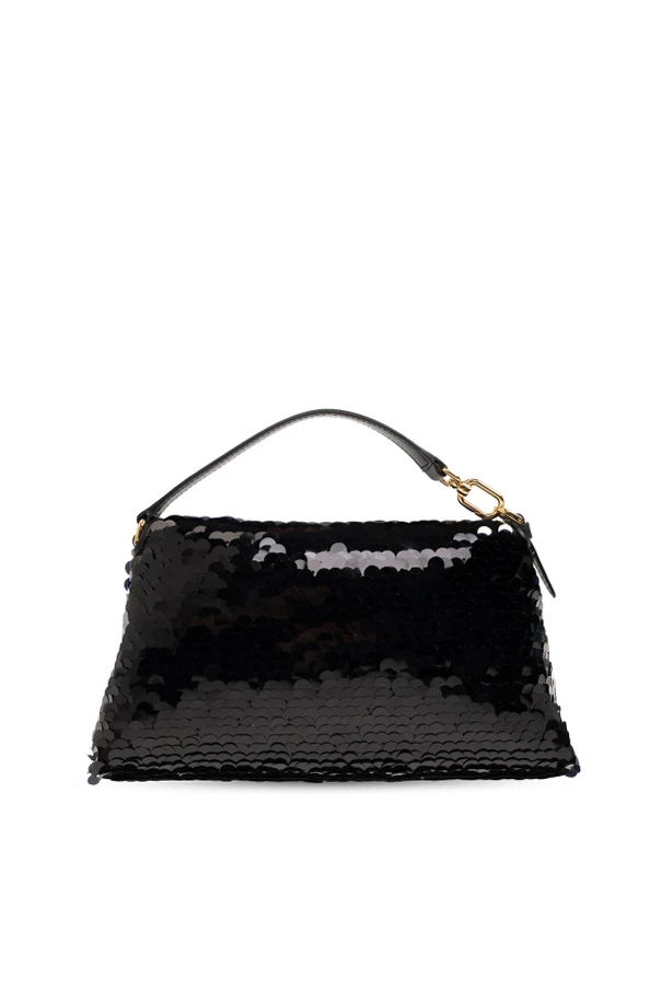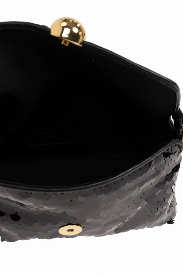 Die Außenseite der Tasche ist mit großen, schwarzen Pailletten bedeckt, die sich schichtweise anordnen und dadurch einen tiefen Glanz und einen einzigartigen visuellen Effekt erzeugen. Das glatte Leder, aus dem der Griff und die Elemente des Riemens gefertigt wurden, verleiht dem Ganzen zusätzliche Noblesse und Langlebigkeit.