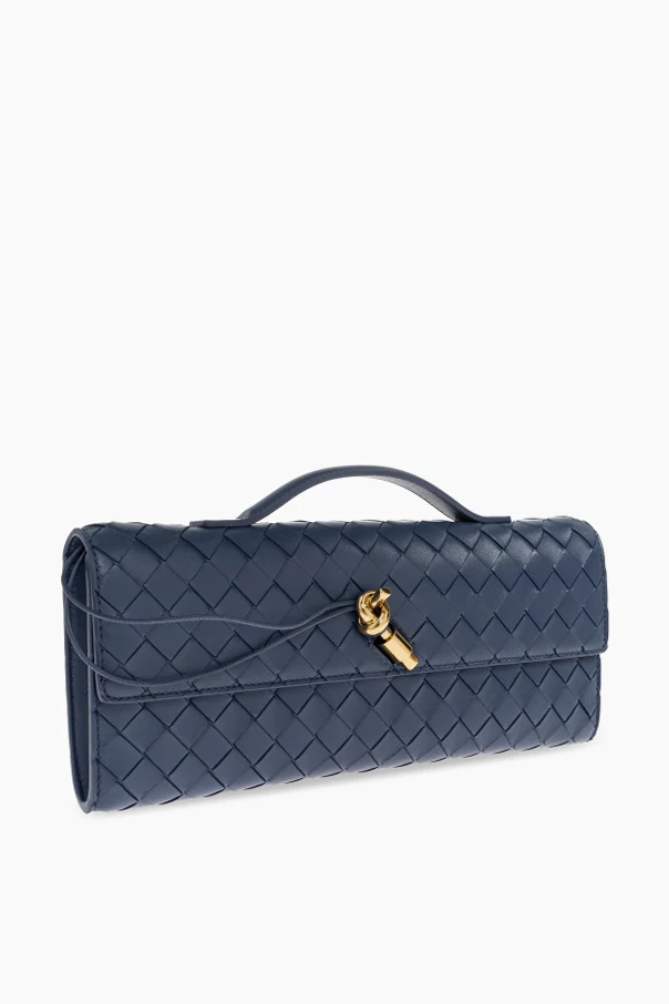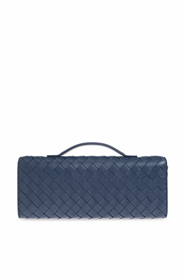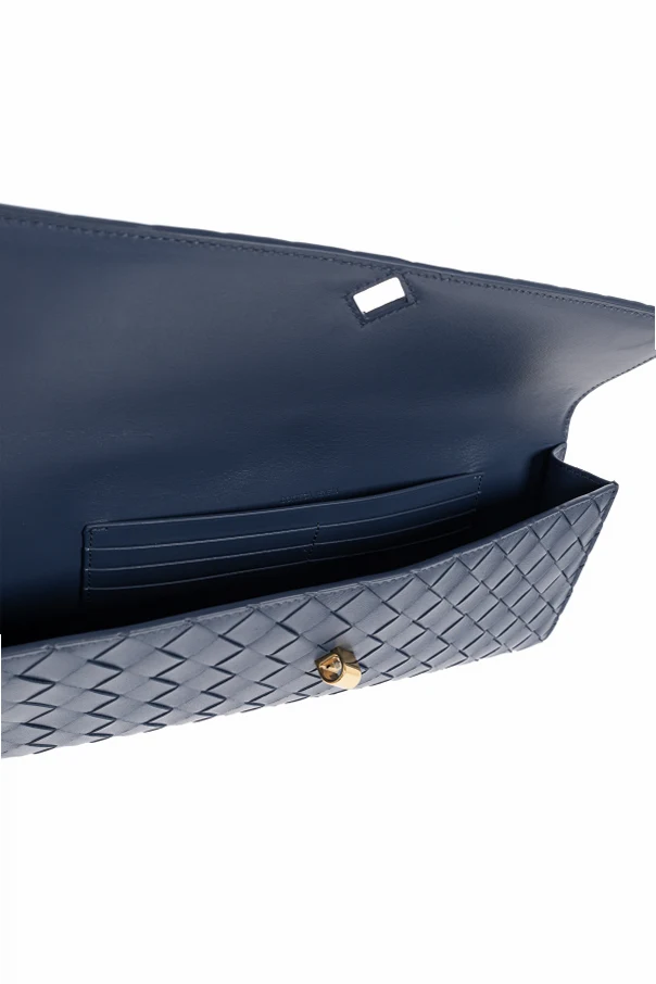 Clutch „Andiamo” aus dem renommierten Modehaus Bottega Veneta verkörpert zeitlose Eleganz in ihrer reinsten Form. Ihre rechteckige, längliche Silhouette besticht durch die flache Struktur und sanft abgerundete Ecken. Das gesamte Modell ist mit einem kunstvollen Geflecht aus Kalbs- und Lammleder überzogen, was die hervorragende Qualität der verwendeten Materialien unterstreicht, während der marineblaue Farbton für zusätzliche Raffinesse sorgt.