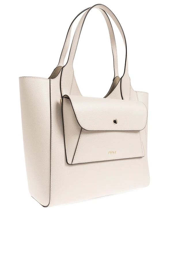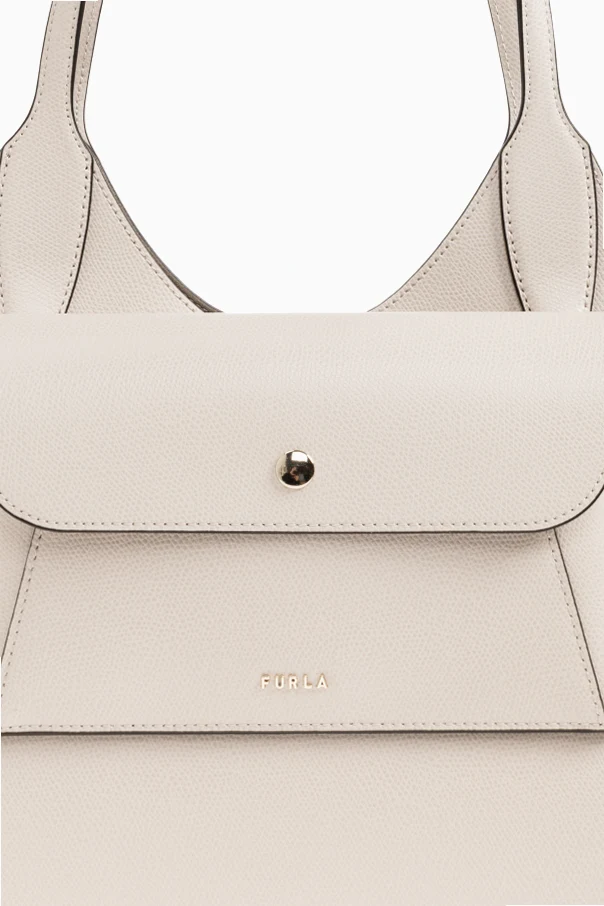 Das glatte, komplett auf unnötige Nähte verzichtende Design lenkt die Aufmerksamkeit auf die edle Materialqualität. Das geprägte, goldene Furla-Logo auf der Vorder- und Rückseite unterstreicht den exklusiven Charakter der Tasche. Für praktische Funktionalität sorgt die große Vordertasche mit Klappe, die durch einen Metallverschluss gesichert wird. Die doppelten, geraden Henkel ermöglichen komfortables Tragen in der Hand oder über der Schulter.