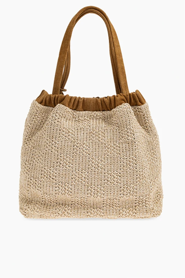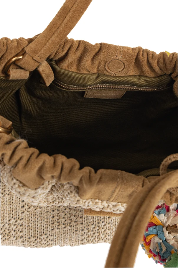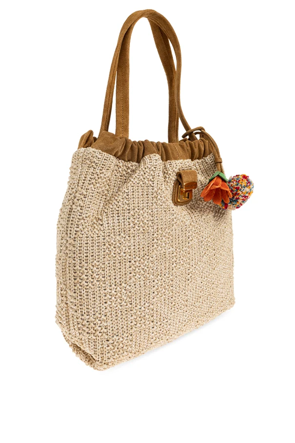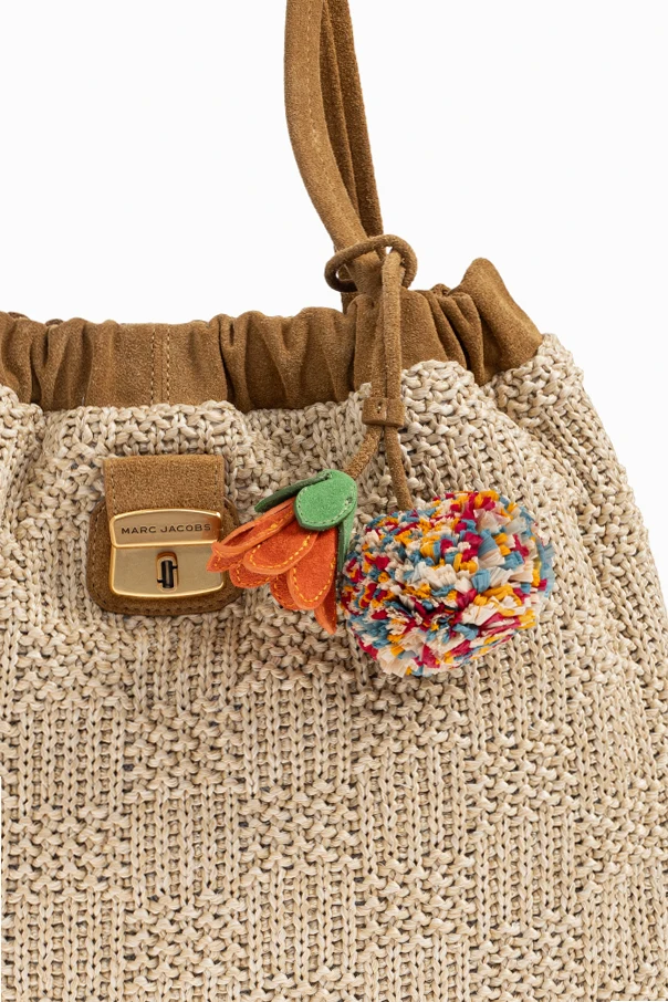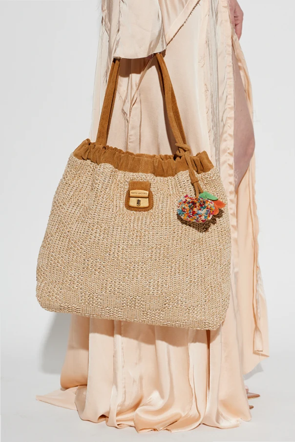 Tasche mit Anhängern von Marc Jacobs ist ein Meisterwerk eklektischen Designs, das zeitlose Klassik mit einer einzigartigen, lebensfrohen Ästhetik vereint. Das beige, geflochtene Material erinnert an natürliche Rattan-Fasern, während die weichen karamellfarbenen Wildlederdetails die Handwerkskunst und Raffinesse des Designs hervorheben.