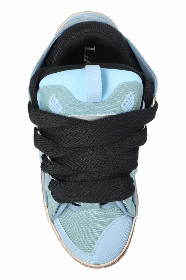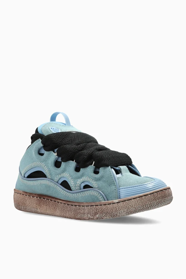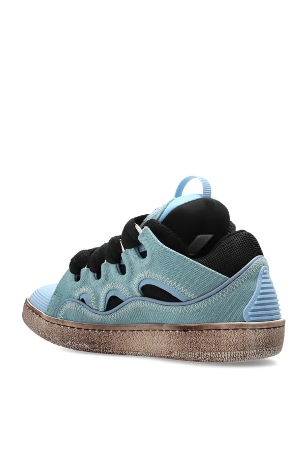 Die Curb Sneakers sind ein außergewöhnliches Angebot des Modehauses Lanvin, das durch seine raffinierte Form und exzellente Handwerkskunst begeistert. Dieses Schuhwerk mit klassischer Low-Top-Sneaker-Silhouette fasziniert durch seine massiven Linien, die auffällig akzentuierte Zunge sowie die markante, strukturierte Sohle in einem Beige-Braun-Ton mit dezentem Patina-Effekt.