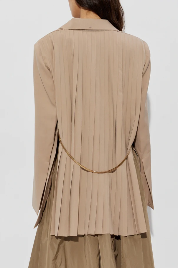 Der hochwertige Anzugstoff mit matter Oberfläche und leichtem Glanz harmoniert perfekt mit dem außergewöhnlichen, plissierten Rückenelement, das optisch an Jacquard erinnert. Vorne unterstreichen harmonisch angeordnete, geräumige Pattentaschen die funktionale Ausrichtung des Designs, während das goldfarbene Detail in der Taille für einen subtilen Glanz sorgt.