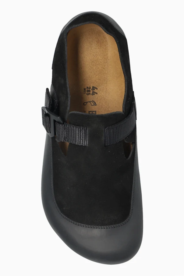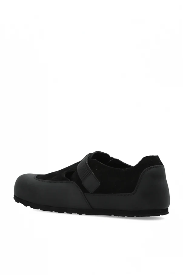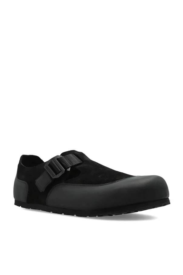 „London Nova 2.0“-Schuhe von Birkenstock sind eine moderne Interpretation klassischer Eleganz, ausgedrückt durch die raffinierte Kombination von mattem Glattleder und dezentem Veloursleder. Die perfekt abgerundete Vorderpartie, der niedrige Schaft und die breite Silhouette betonen die edle Schlichtheit, die durch einen breiten Riemen mit massiver, rechteckiger Schnalle sowie Belüftungsschlitze aufgelockert wird. Das Gesamtbild ist in einem tiefen, einheitlichen Schwarz gehalten, was dem Schuh einen industriellen und zugleich zeitlosen Charakter verleiht.