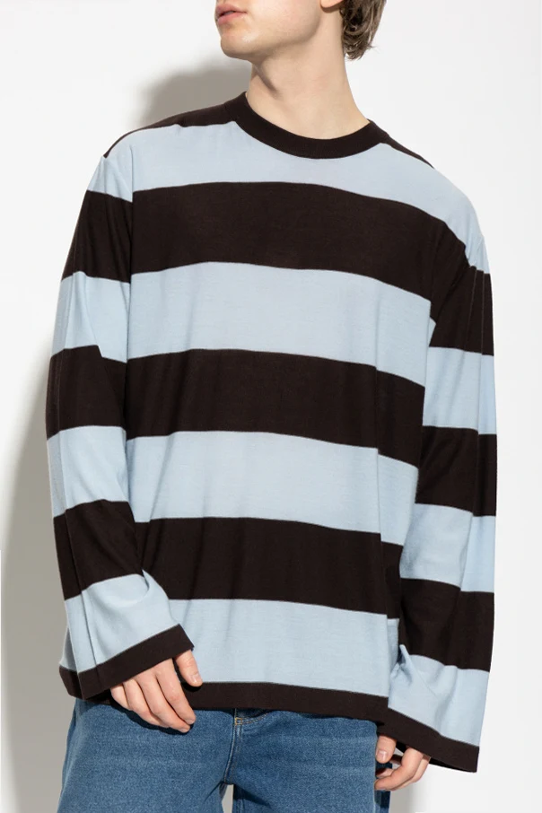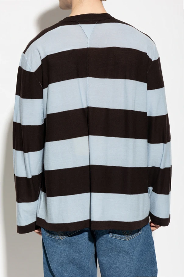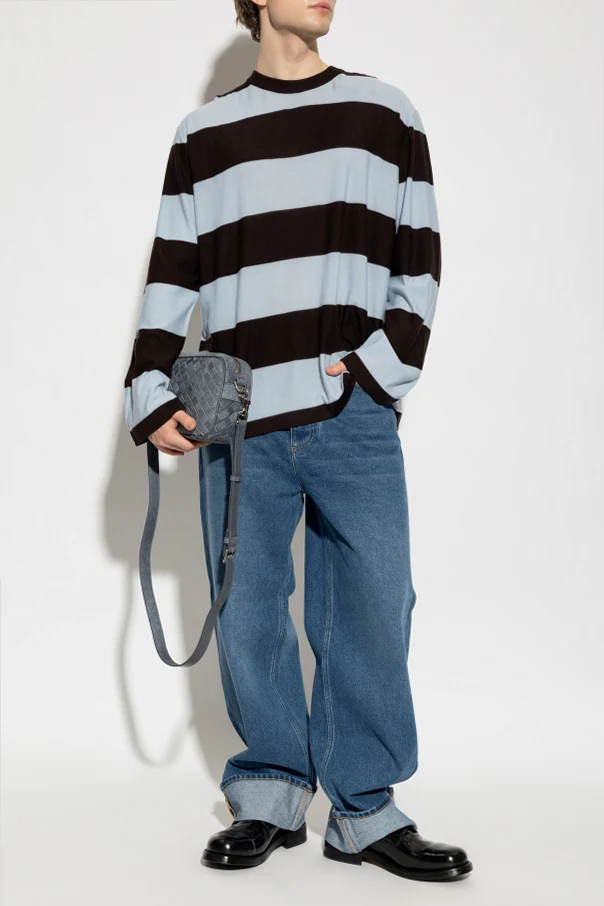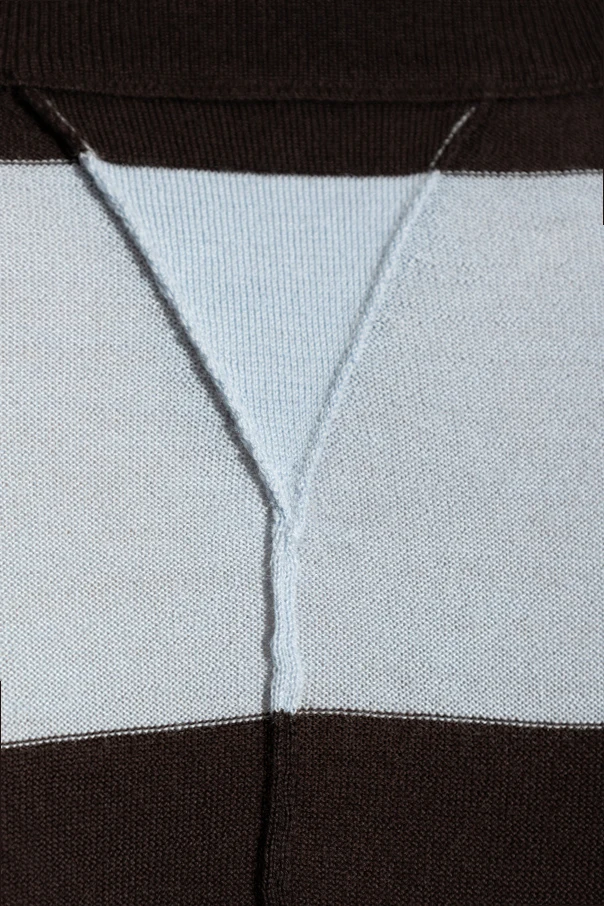 Der Kaschmirpullover von Bottega Veneta ist die Quintessenz zeitloser Eleganz und Luxus. Das Modell in einem raffinierten hellblauen Farbton wird durch markante, breite horizontale Streifen in dunkelbraun durchbrochen und kreiert so ein unverwechselbares, künstlerisches Muster.