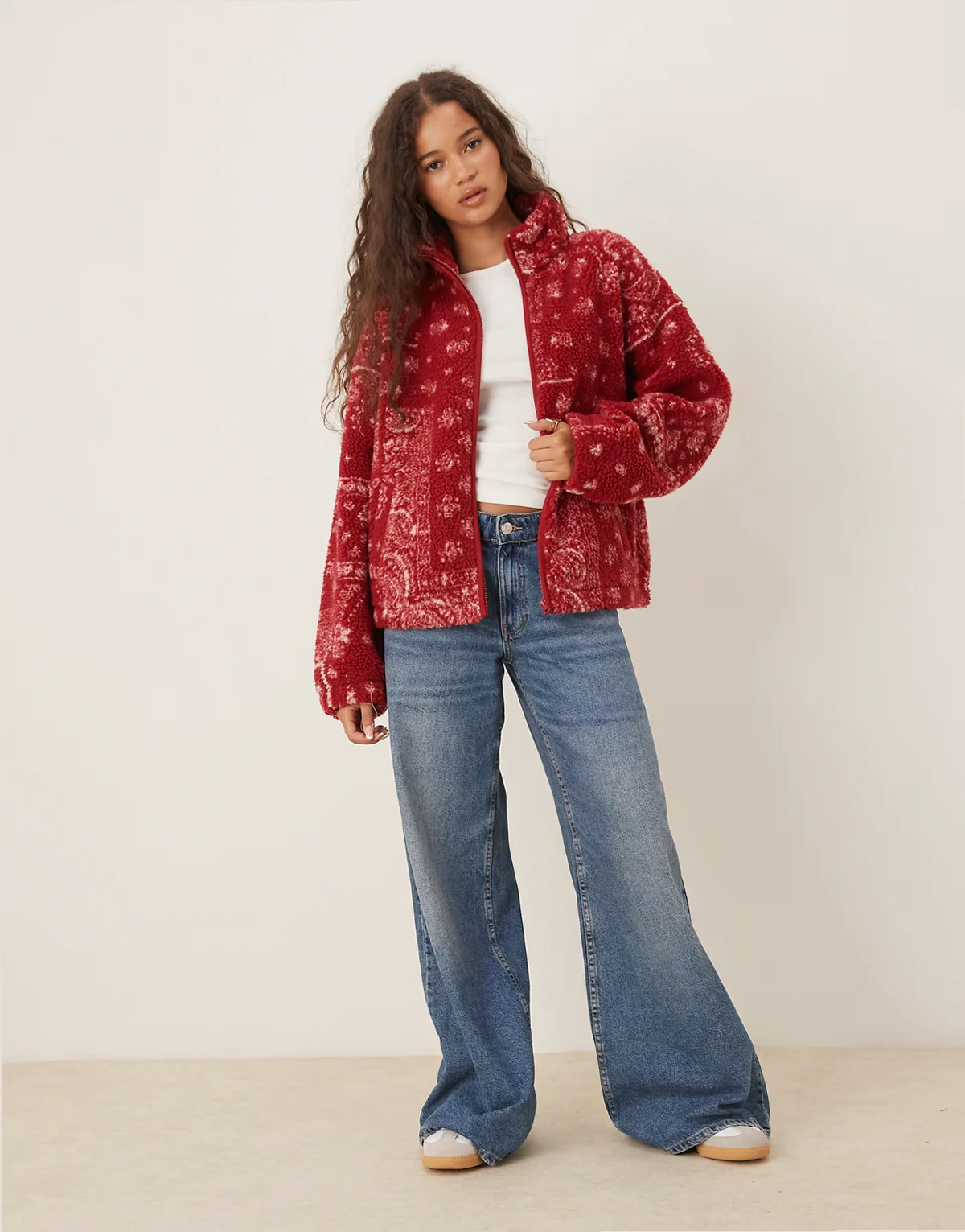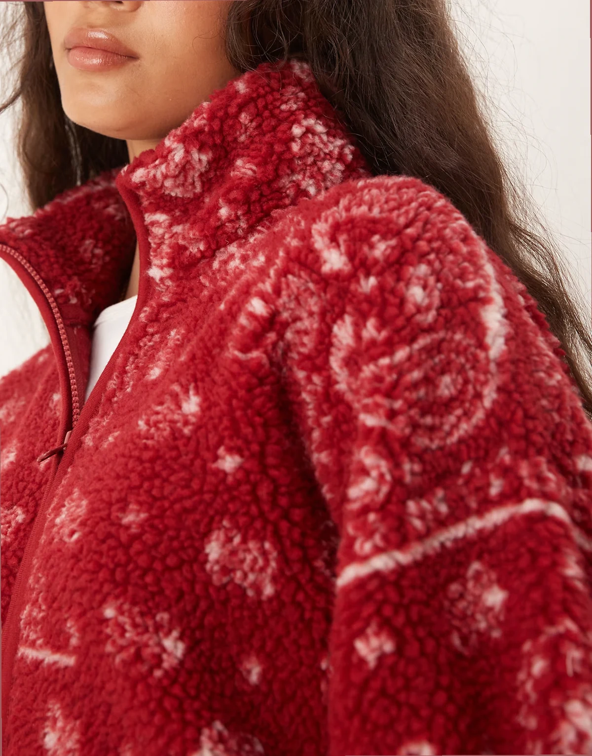 – Fleecejacke in Burgunderrot mit Reißverschluss und Bandana-Print