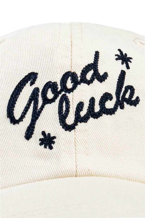 Die intensiv WEISSE Farbnuance der Cap bildet den perfekten Hintergrund für die präzise gestickte Aufschrift „Good luck“ in einem tiefen Navyblau, kunstvoll ergänzt durch feine Sternenstickereien. Diese Details unterstreichen die Einzigartigkeit des Designs, ebenso wie das dezente, gestickte Emblem „THE UPSIDE“ auf der Rückseite der Cap.