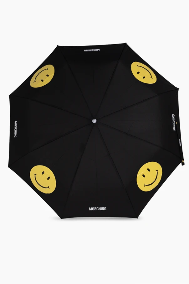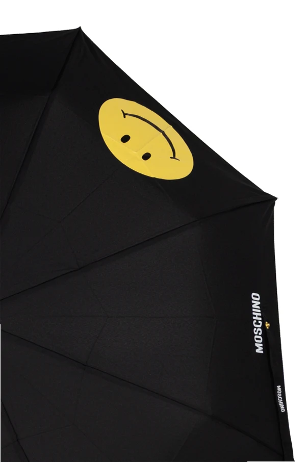Regenschirm Moschino x SMILEY ist ein raffiniertes Accessoire, das auf harmonische Weise extravaganten Charakter mit Funktionalität verbindet. Er zeichnet sich durch eine klassische, runde Form aus, und das Design fällt sofort durch den Kontrast zwischen schwarzem Hintergrund und großen, gelben „Smiley Face“-Motiven ins Auge, die Optimismus und fröhliche Provokation symbolisieren – Werte, die der Marke Moschino besonders nahestehen.