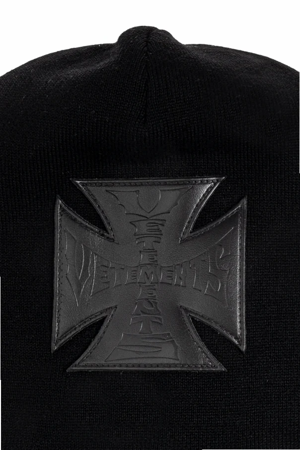 Auf der Vorderseite dominiert raffiniert ein außergewöhnlicher Aufnäher in Form eines Kreuzes, gefertigt aus schwarzem Leder, mit dem präzise geprägten Logo "VETEMENTS". Dieses Detail verleiht dem Ganzen einen unverwechselbaren Charakter. Es handelt sich um ein einzigartiges Element, das einen klaren Ausdruck von Stil und Designkunst des Designers darstellt.