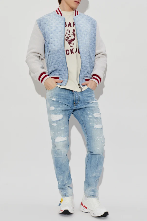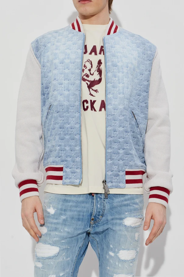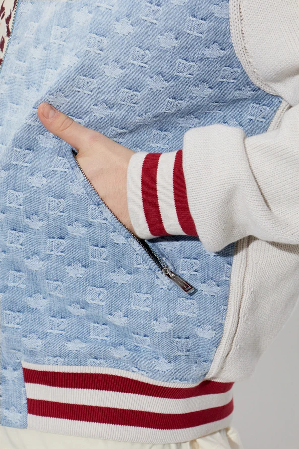 Jeansjacke mit Monogramm von Dsquared2 ist ein raffiniertes Beispiel meisterhafter Handwerkskunst, bei dem klassische Elemente auf moderne Akzente treffen. Der schlichte, maskuline Bomber-Schnitt verbindet harmonisch hellblauen Jeansstoff mit markanter Struktur und elegante Ärmel aus Off-White Strick.