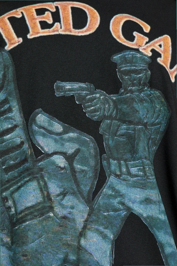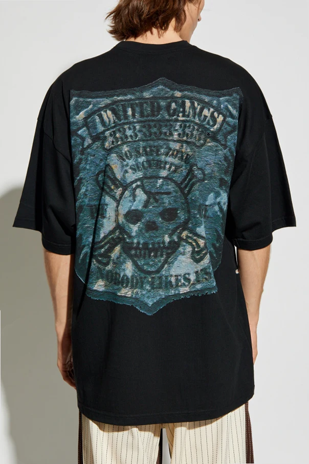 Die schwarze Farbe bildet einen zeitlosen Hintergrund für auffällige, ausdrucksstarke Prints: Auf der Vorderseite zieht ein Motiv eines bewaffneten Polizisten in Blau-Grün-Tönen die Blicke auf sich, umgeben von den Slogans „UNITED GANG“ und „NO PEACE FOR US“. Ebenfalls ins Auge fällt ein kleines gelbes Element, das an ein Etikett erinnert. Die Rückseite des T-Shirts ziert ein spektakulärer Print mit Totenkopf, gekreuzten Stöcken und der Aufschrift „UNITED GANGS“, der die Komposition um eine künstlerische Note bereichert.