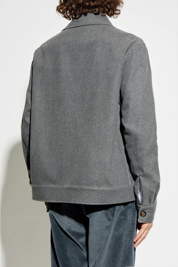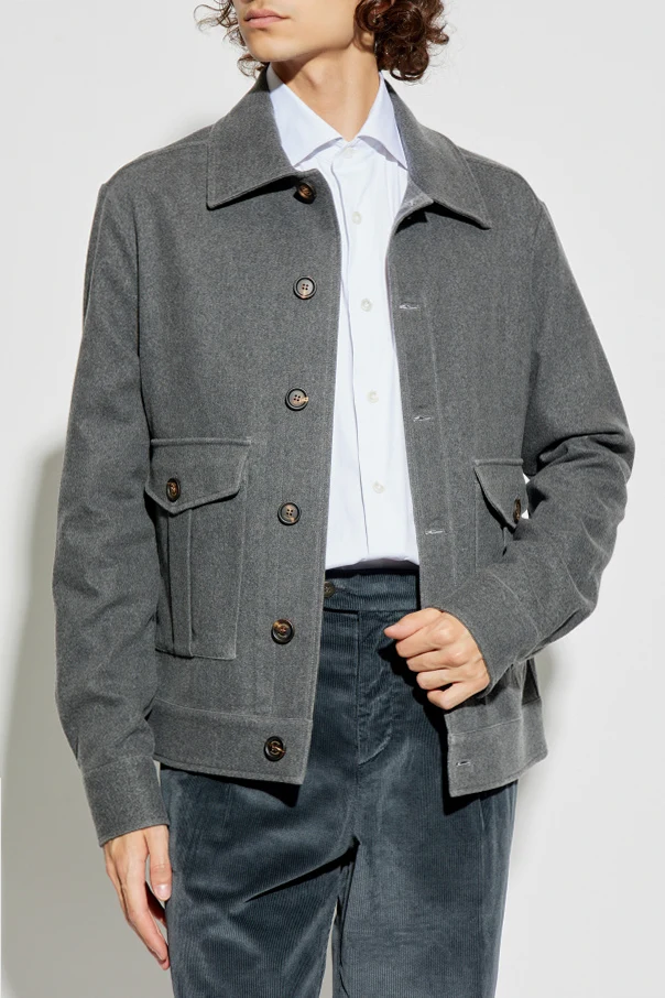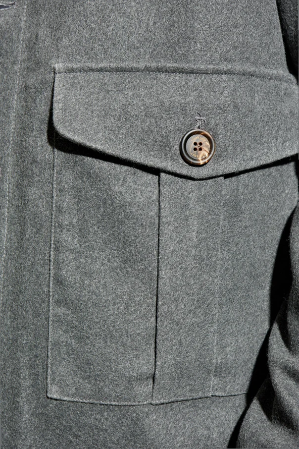 Die meisterhafte Verarbeitung zeigt sich in den Details: klassischer Hemdkragen, kontrastierende braune Knöpfe sowie markante, geometrische Pattentaschen, die sich deutlich vom minimalistischen Gesamtbild abheben. Ein breiter Saum am unteren Rand sowie Manschetten mit einem einzelnen Knopf unterstreichen die raffinierte Struktur. Dieses Modell verkörpert die Quintessenz zeitlosen Stils mit einer Prise moderner, anspruchsvoller Schlichtheit.