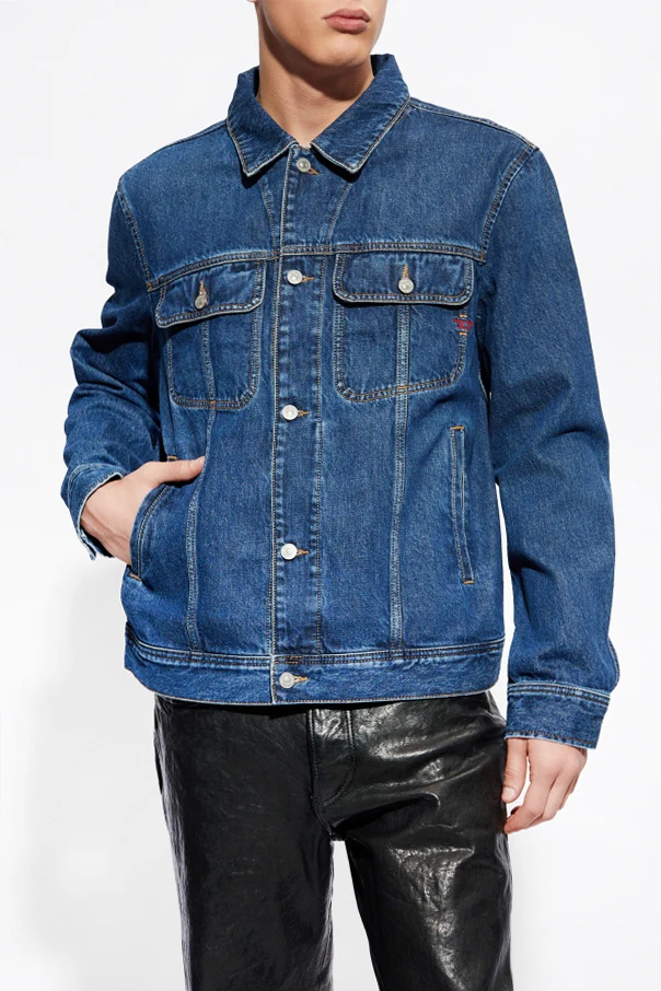 Dunkelblaue Jeansjacke, Modell ‚D-BARCY‘ von Diesel. Hergestellt aus Baumwolle. Mit Knöpfen zu schließen. Verziert mit einem aufgestickten roten Logo. Vorne vier Taschen, zwei mit Klappe und Knopfverschluss. Lange Ärmel, Manschetten mit Knopfverschluss.