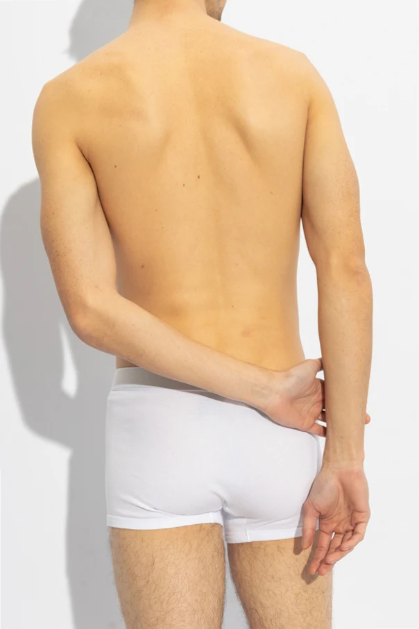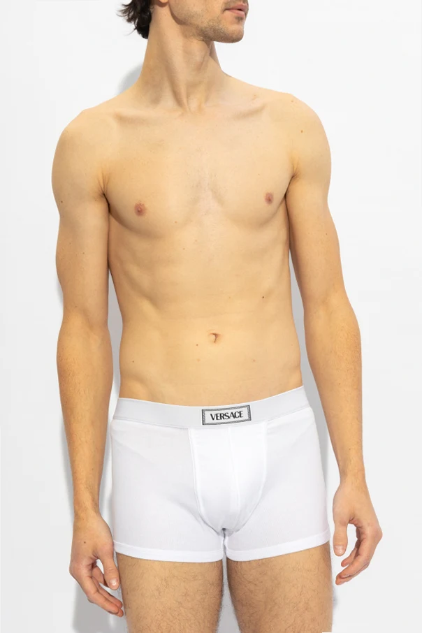 White ribbed boxers from Versace. Decorated with a black logo pattern, this pair features an elastic waistband.