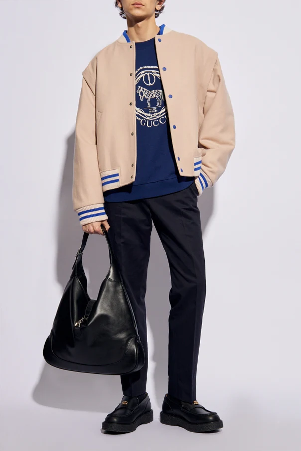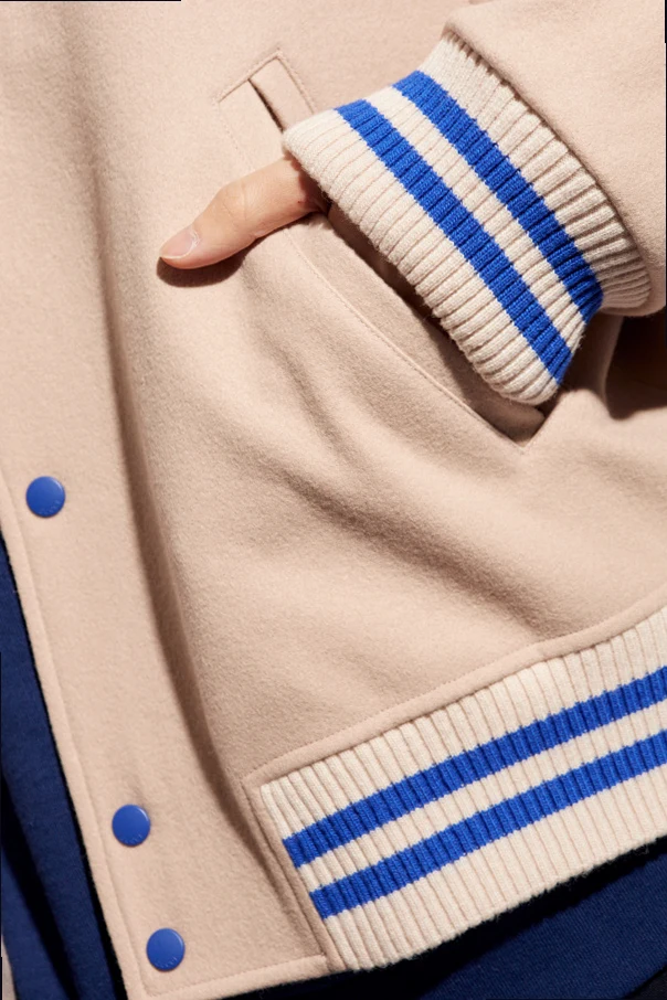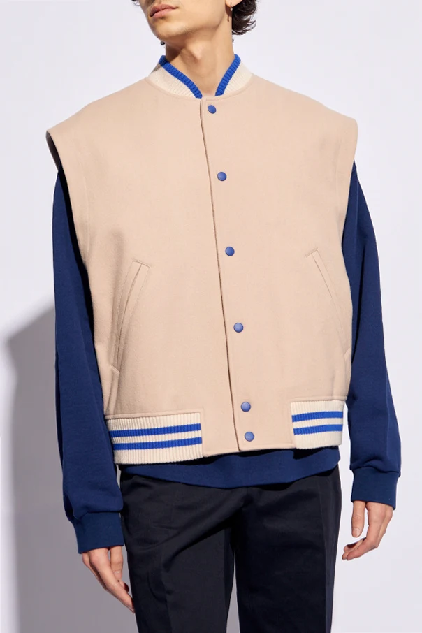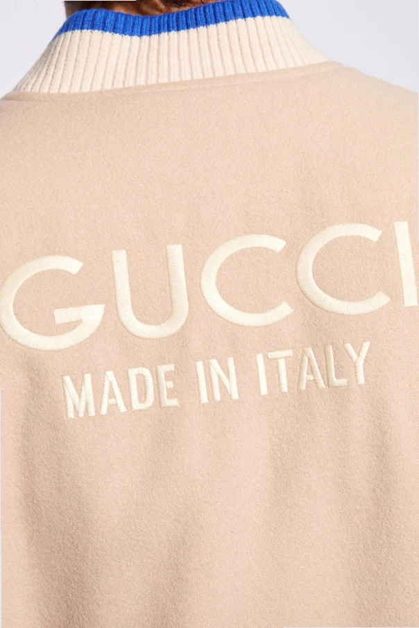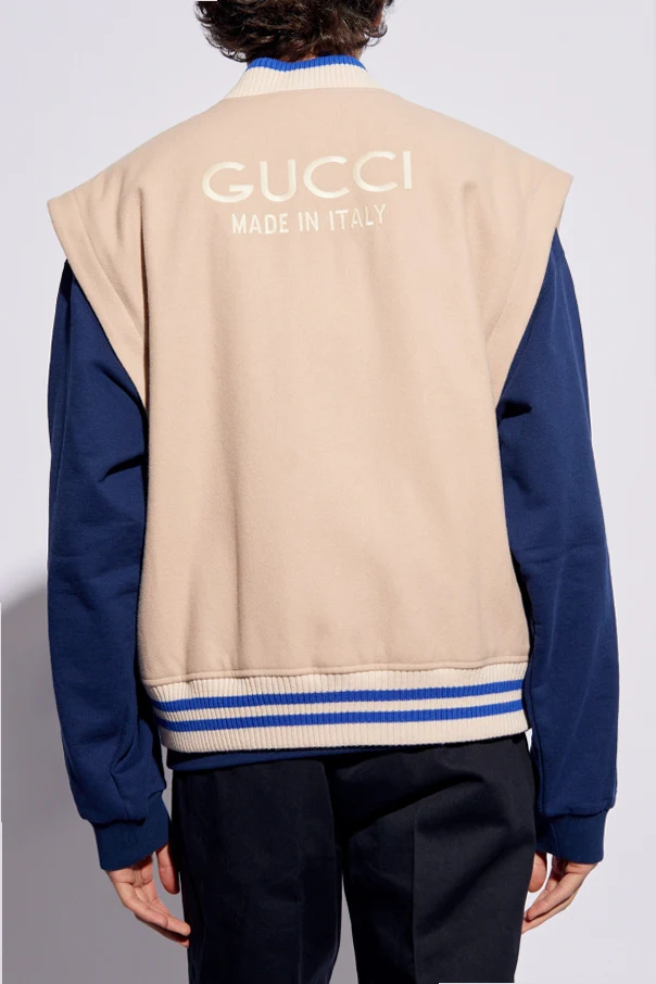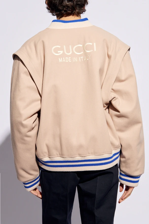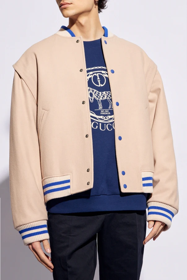 Light pink, cream and blue bomber jacket from Gucci. Made from wool, this style features snap fastenings, two welt pockets, detachable long sleeves and ribbed trims on the standing collar and hem.