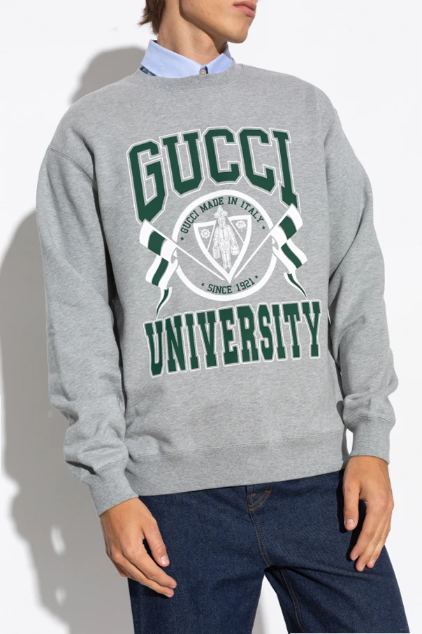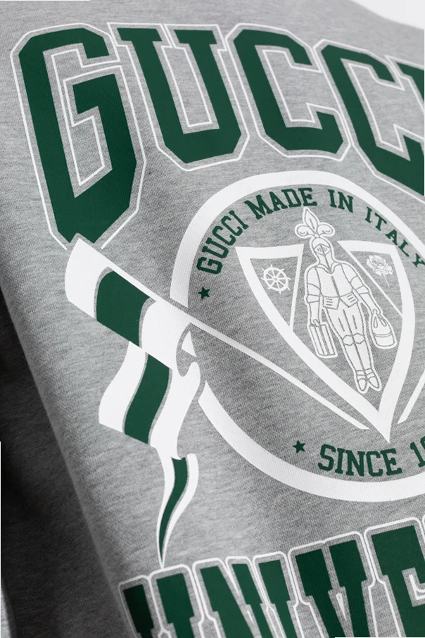 Auf der Vorderseite des Sweatshirts befindet sich ein großer, auffälliger Aufdruck in Grün und Weiß, der den Schriftzug "GUCCI UNIVERSITY" sowie ein Wappen mit der Aufschrift "GUCCI MADE IN ITALY SINCE 1921" darstellt. Das Wappen, das eine Figur und Flaggen enthält, verleiht dem Sweatshirt einen universitären Charakter.