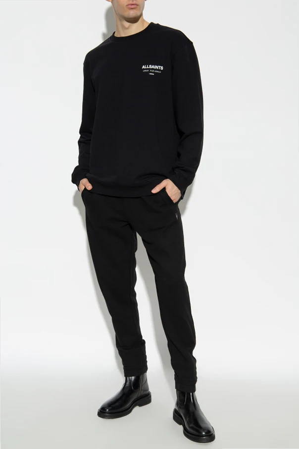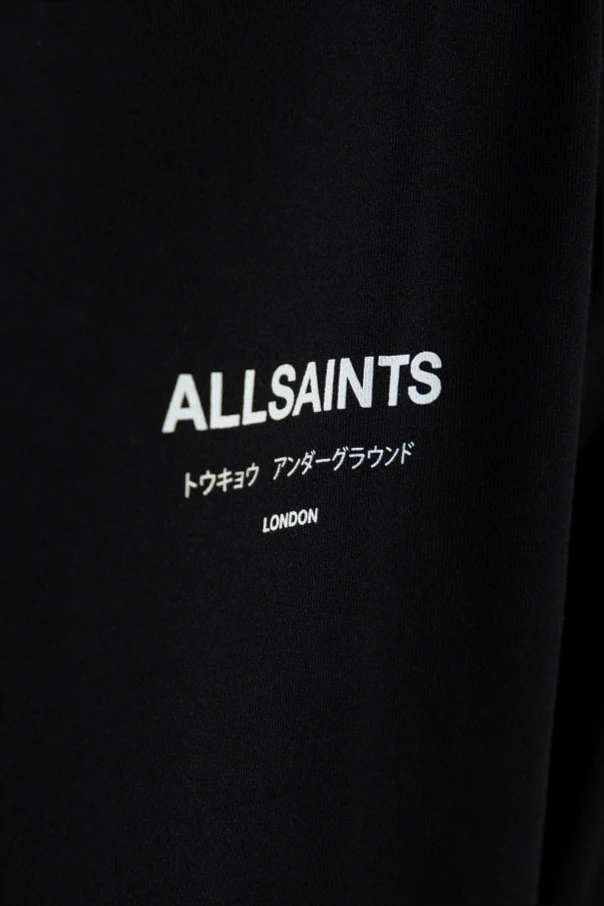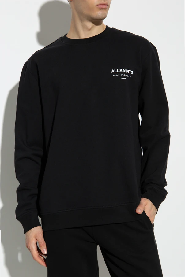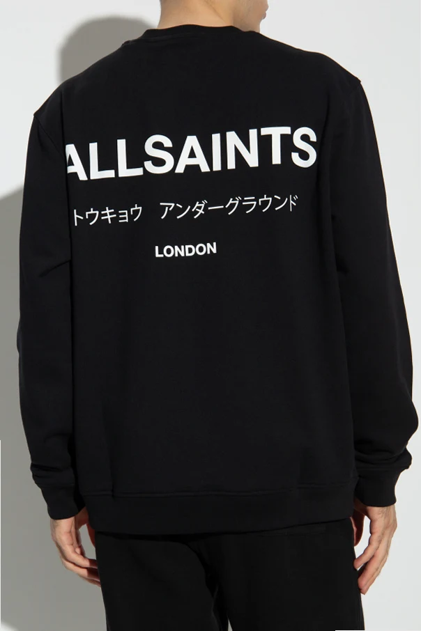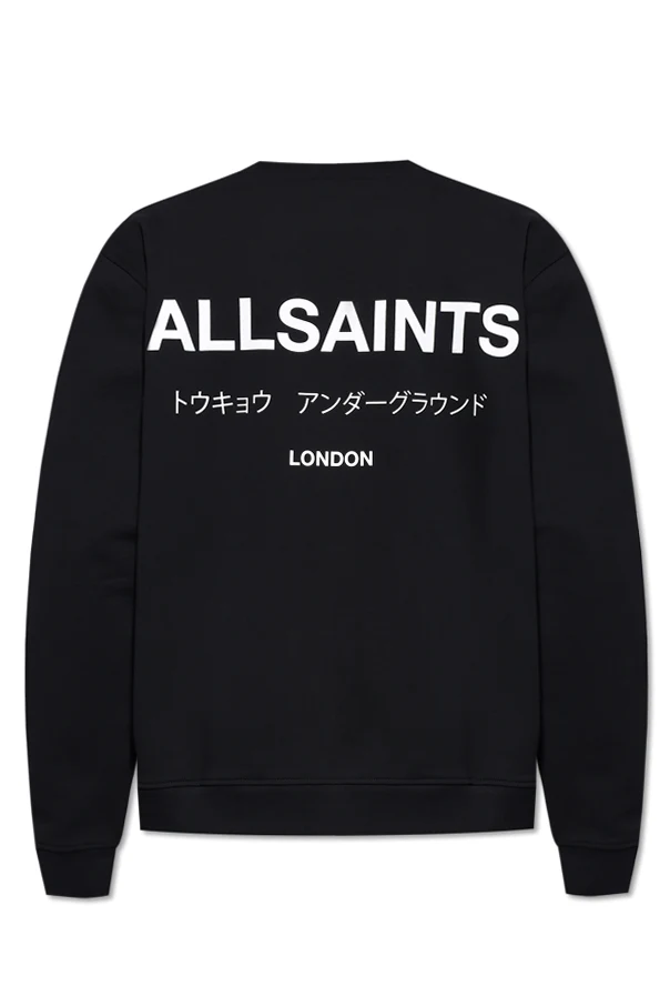 Auf der linken Brust und auf dem Rücken des Sweatshirts befinden sich die Aufschriften "ALLSAINTS", "LONDON" sowie kleinere Aufschriften in japanischer und englischer Sprache, die in weißer Farbe ausgeführt sind und einen markanten Kontrast zum schwarzen Hintergrund bilden.