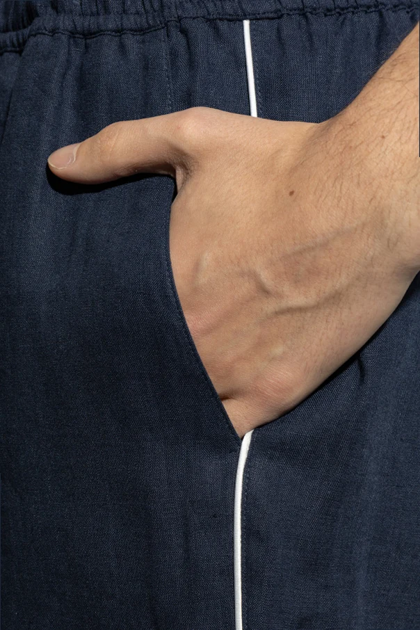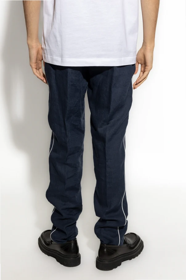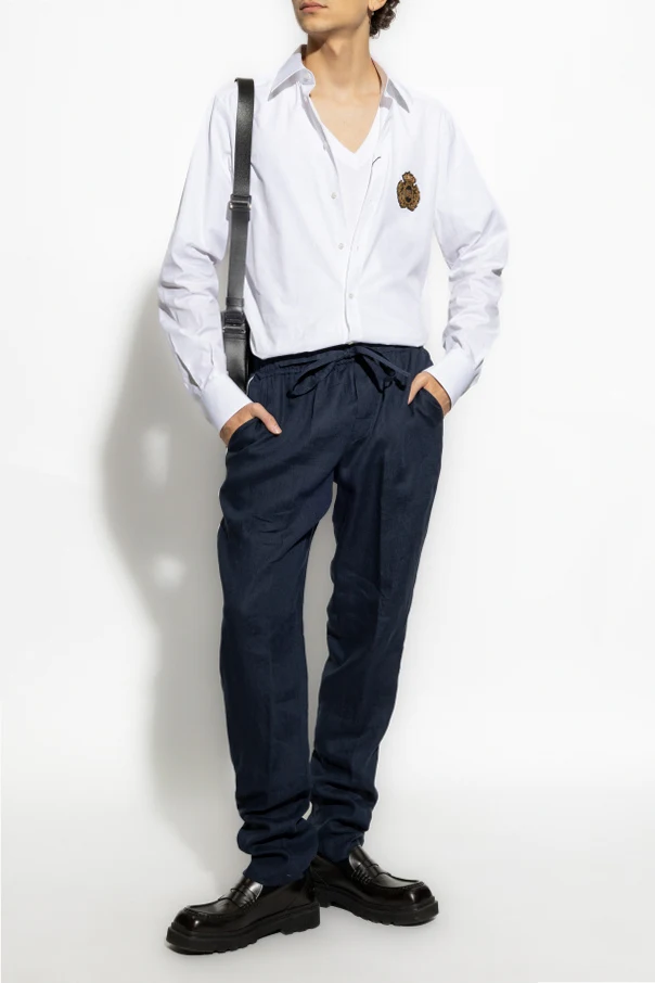 Entdecken Sie den einzigartigen Charme der Leinenhosen aus der exklusiven Kollektion von Dolce & Gabbana . Ihre marineblaue Farbe, die mit zarten weißen Streifen entlang der Rückseite der Hosenbeine harmoniert, schafft ein Gefühl subtiler Eleganz. Gefertigt aus hochwertigem Leinen mit einem Seidenanteil, bieten sie nicht nur Komfort, sondern auch Langlebigkeit.