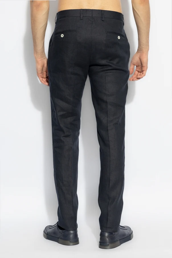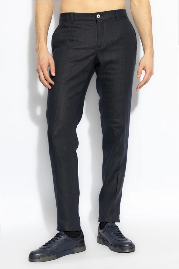 Wir präsentieren die Leinenhose mit Bügelfalte der renommierten Marke Dolce & Gabbana , die mit ihrer Eleganz und Vielseitigkeit begeistert. Hergestellt aus hochwertigem Leinen, sind diese marineblauen Hosen die Quintessenz von Leichtigkeit und Atmungsaktivität, was sie zur idealen Wahl für warme Tage macht.