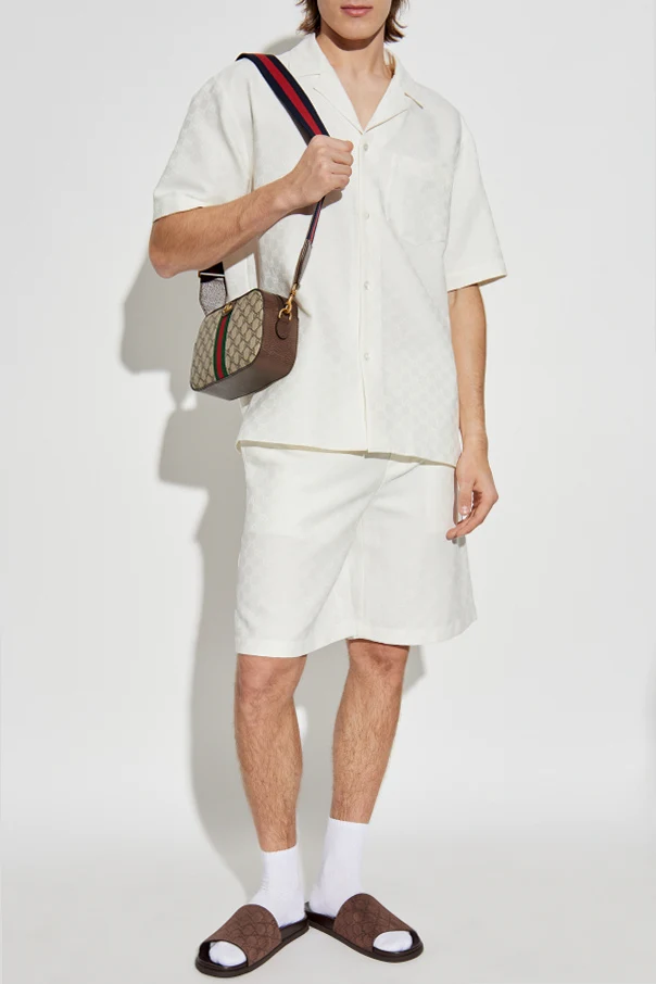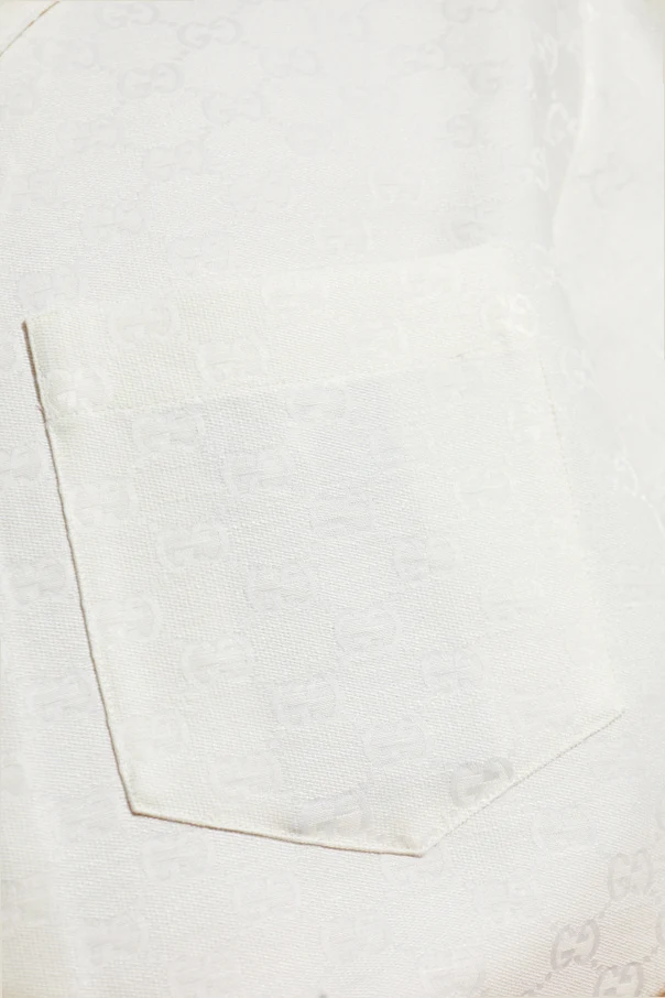 Gefertigt aus leichtem und atmungsaktivem Material, einer Mischung aus Leinen und Polyester, bietet es unvergleichlichen Tragekomfort. Das subtile, sich wiederholende GG-Muster, das den Stoff ziert, ist ein charakteristisches Merkmal dieser renommierten Marke.
