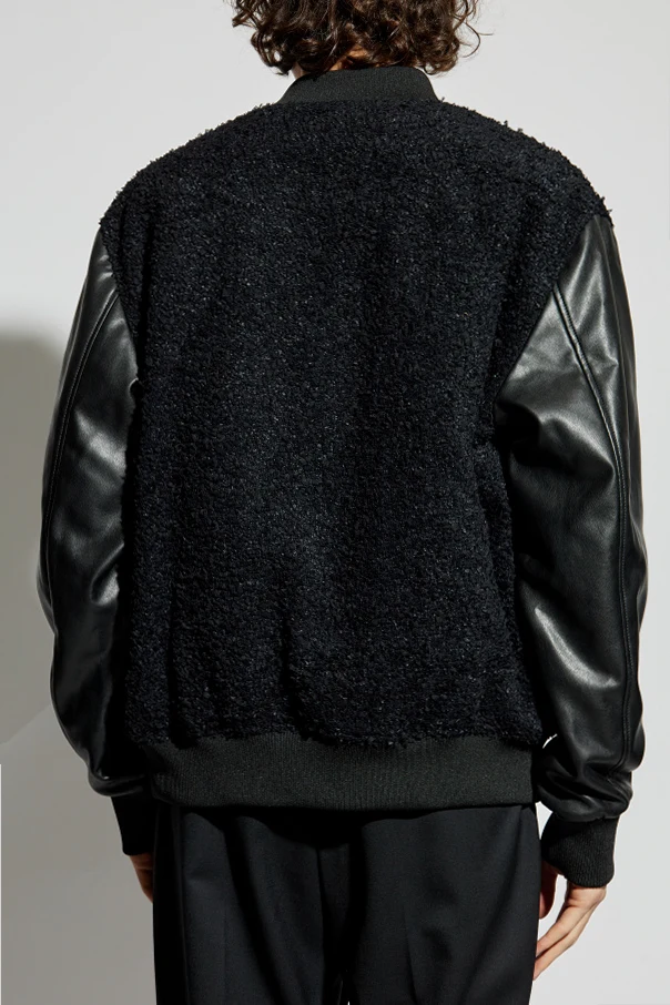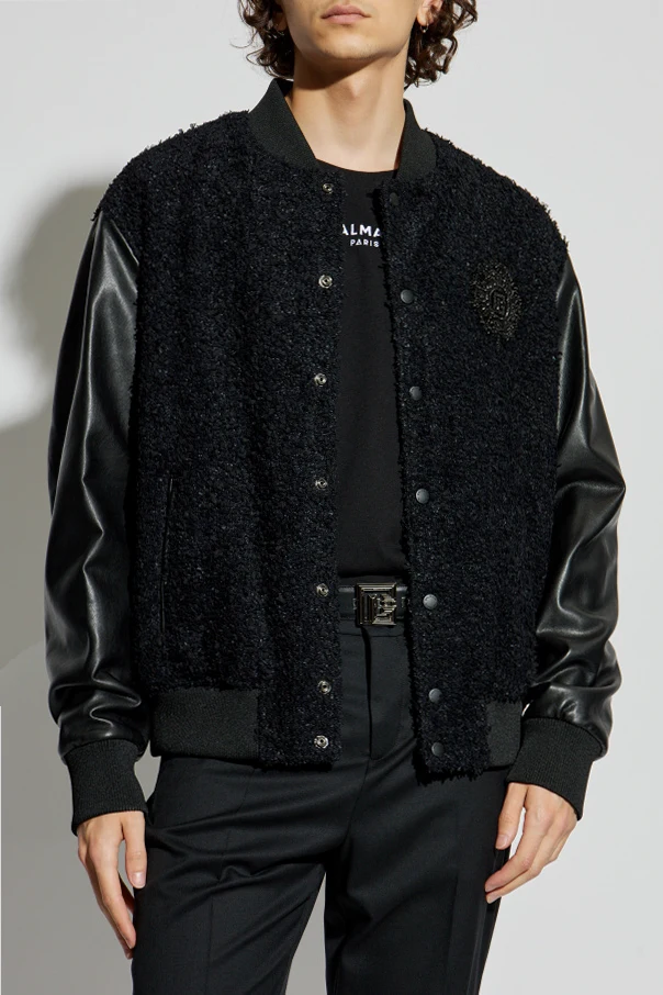 Das Korpus aus schwarzem Bouclé-Material mit markanter Struktur bildet einen sinnlichen Kontrast zu den glatten Lederärmeln und unterstreicht die Einzigartigkeit des Designs. Der einheitliche, minimalistische Stil wird durch einen wirkungsvollen Monogramm-Aufnäher auf der Brust durchbrochen, der ein dezentes Symbol für das meisterhafte Erbe von Balmain ist.