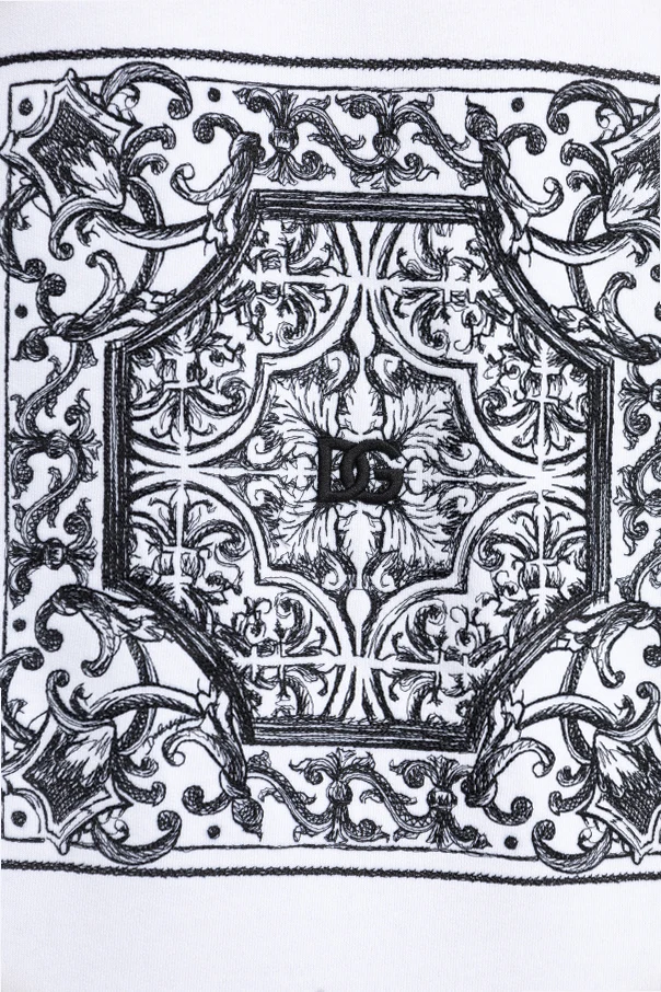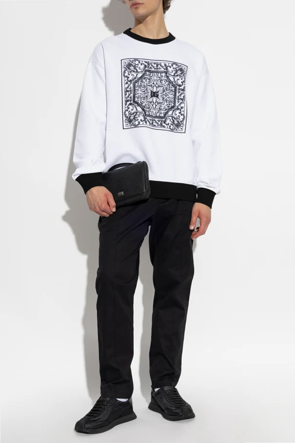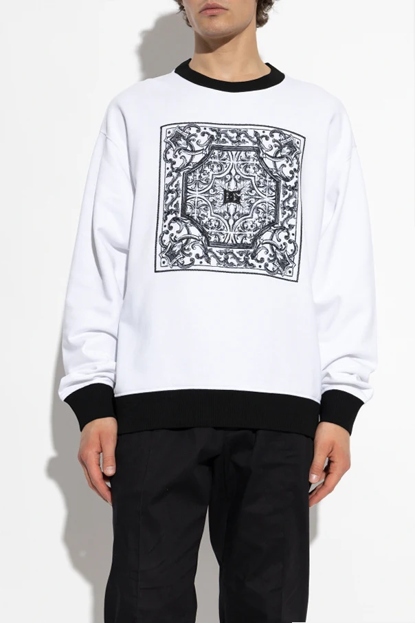 Das zentrale Element des Sweatshirts ist das reich verzierte, kunstvoll gestickte Motiv, inspiriert von der Ornamentik der Majolika – ein äußerst dekoratives Muster, das an die Atmosphäre klassischer italienischer Keramikverzierungen erinnert. Der prestigeträchtige Charakter des gesamten Stücks wird durch kontrastierende schwarze Bündchen und das feine Designer-Logo „DG“, das geschickt in das Hauptmotiv integriert ist, unterstrichen.