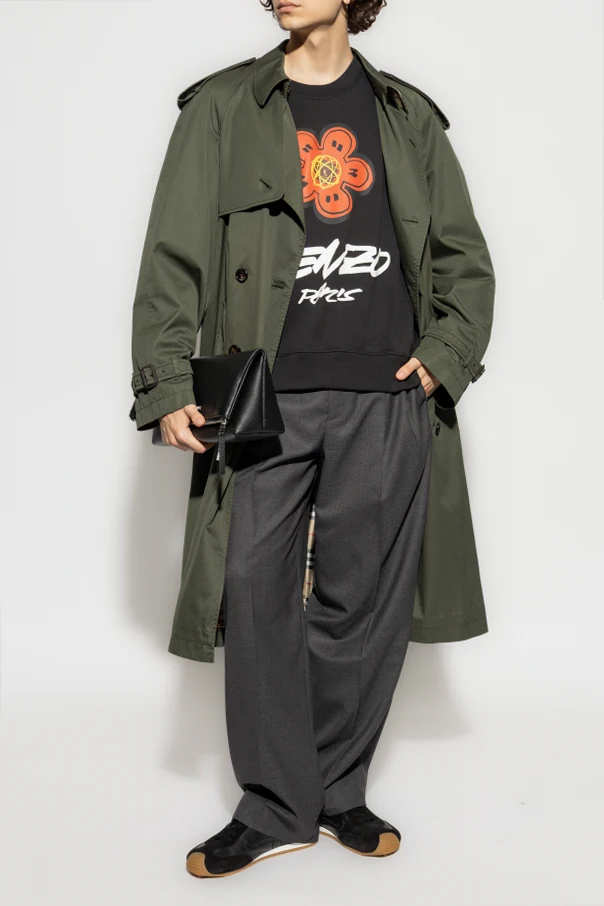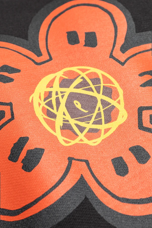 KENZO Sweatshirt mit Print ist eine raffinierte Wahl für Liebhaber gewagter Ausdrucksformen und herausragender Designkunst. Sie besticht durch ihre tiefschwarze Farbe sowie den klassischen Crewneck-Schnitt, der die Silhouette perfekt betont. Auf der Vorderseite dominiert eine große, fünfblättrige Blume in intensiven Orange- und Gelbtönen, die mit einem abstrakten zentralen Muster und dem markanten Schriftzug „KENZO PARIS“ im Stil der Street-Art begeistert. Auf dem Rücken befinden sich der Schriftzug „NIGO VILGELME“ sowie ein dezentes Markenlogo-Label.