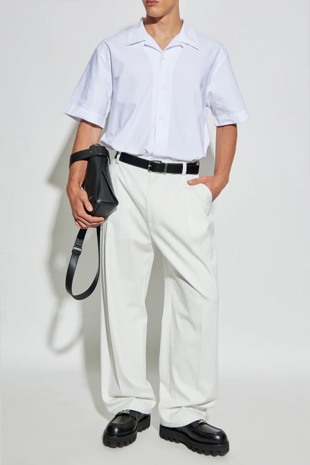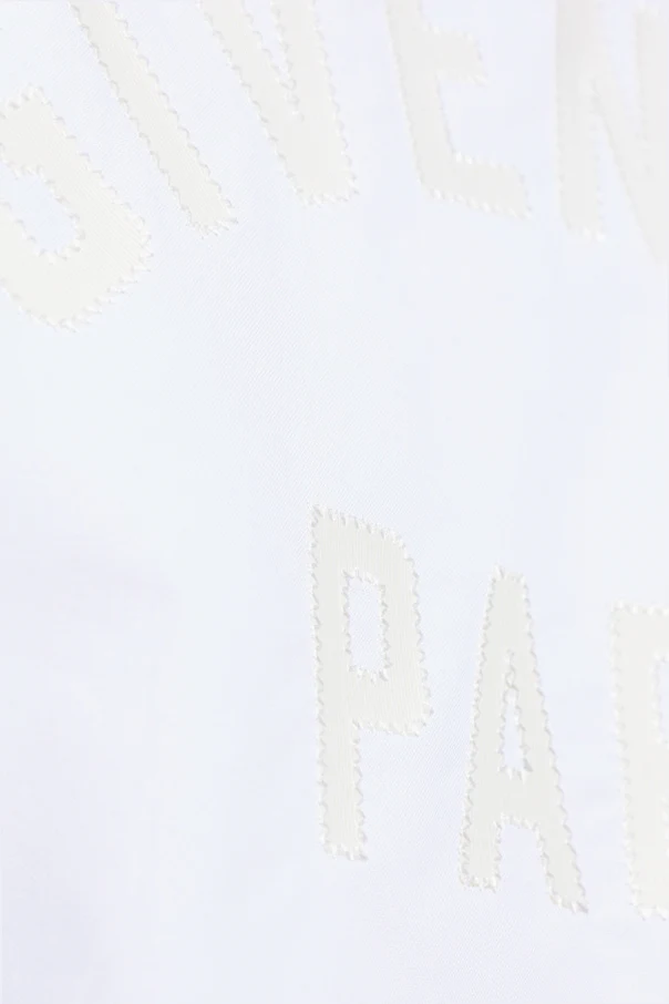 Die dominante weiße Farbe verleiht dem Ganzen eine unvergleichliche Leichtigkeit und Raffinesse. Das Hemd ist mit verdeckten, farblich passenden Knöpfen zu schließen. Das Fehlen sichtbarer Taschen und Aufnäher schafft eine harmonische, minimalistische Komposition. Ein besonderes Highlight bildet die große, subtile „GIVENCHY PARIS“-Stickerei auf der Rückseite – das unverkennbare Zeichen des aristokratischen Stils.