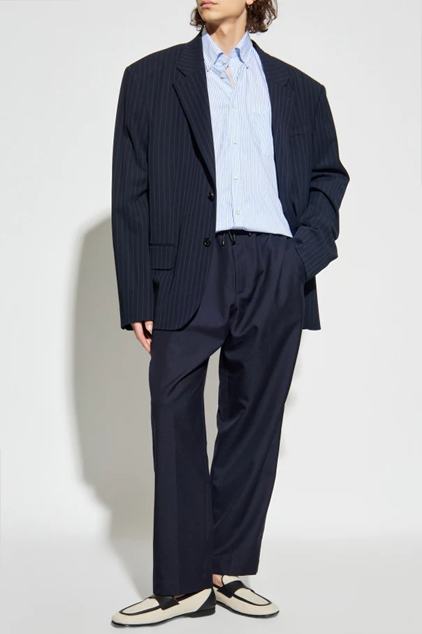 Das gesamte Hemd wird von einem dezenten, vertikalen blauen Streifenmuster auf weißem Grund geschmückt, das ein äußerst elegantes und zugleich universell einsetzbares Erscheinungsbild schafft. Der Button-Down-Kragen verleiht der Komposition eine moderne Frische und bleibt dennoch der klassischen Linie treu.