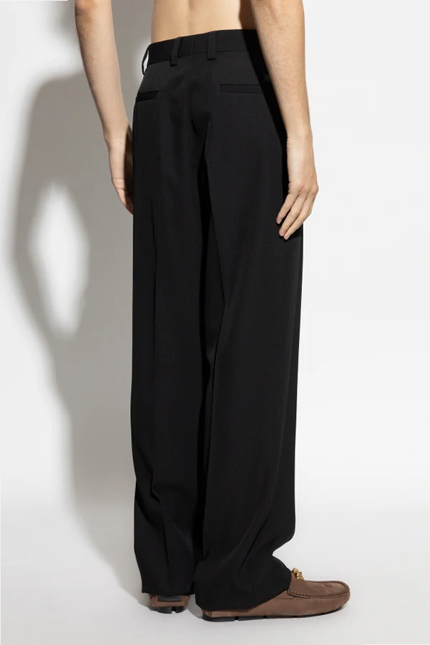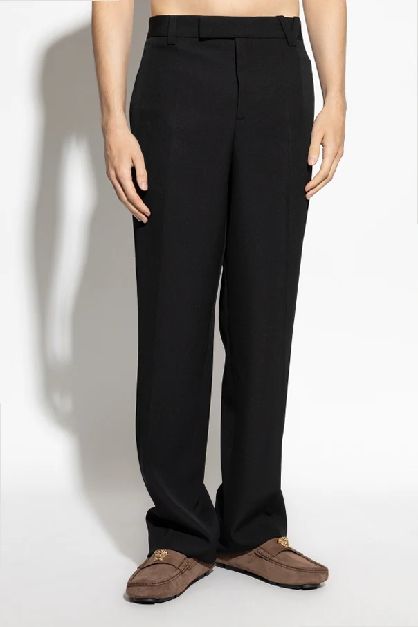 Wollhose mit Bügelfalte ist eine moderne Interpretation zeitloser Eleganz, gekennzeichnet durch die meisterhafte Handschrift des Hauses Versace. Ihr klassischer, gerader Schnitt mit dezent weiterem Bein in Kombination mit einer markanten, scharfen Bügelfalte betont den stilvollen, anzugähnlichen Charakter.