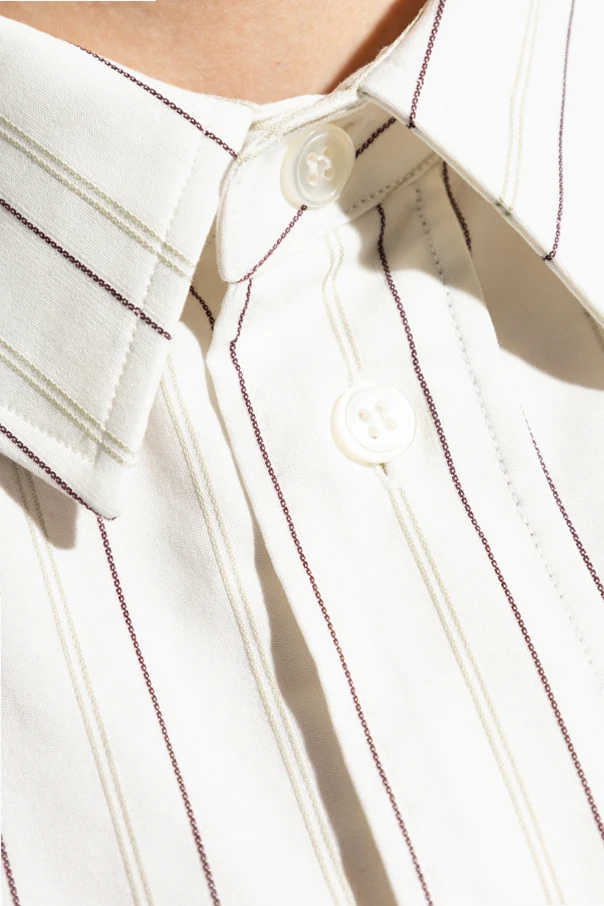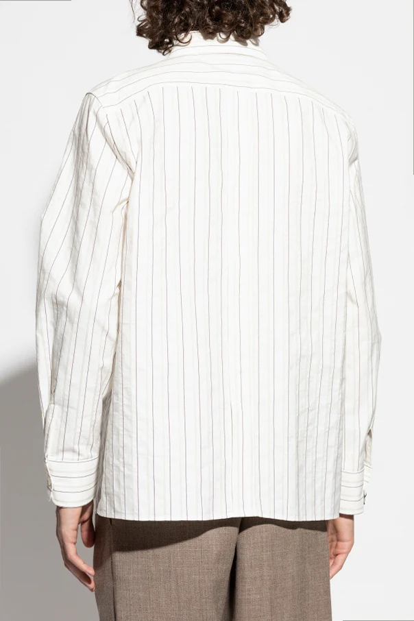 Gestreiftes Hemd der Marke Saint Laurent ist eine perfekte Verbindung aus klassischer Eleganz und moderner Raffinesse. Das Modell in schneeweißer Farbe ist mit einem dezenten Muster aus vertikalen Streifen in tiefem Bordeauxrot und sanftem Grau verziert, was ihm einen einzigartigen, zeitlosen Charakter verleiht.