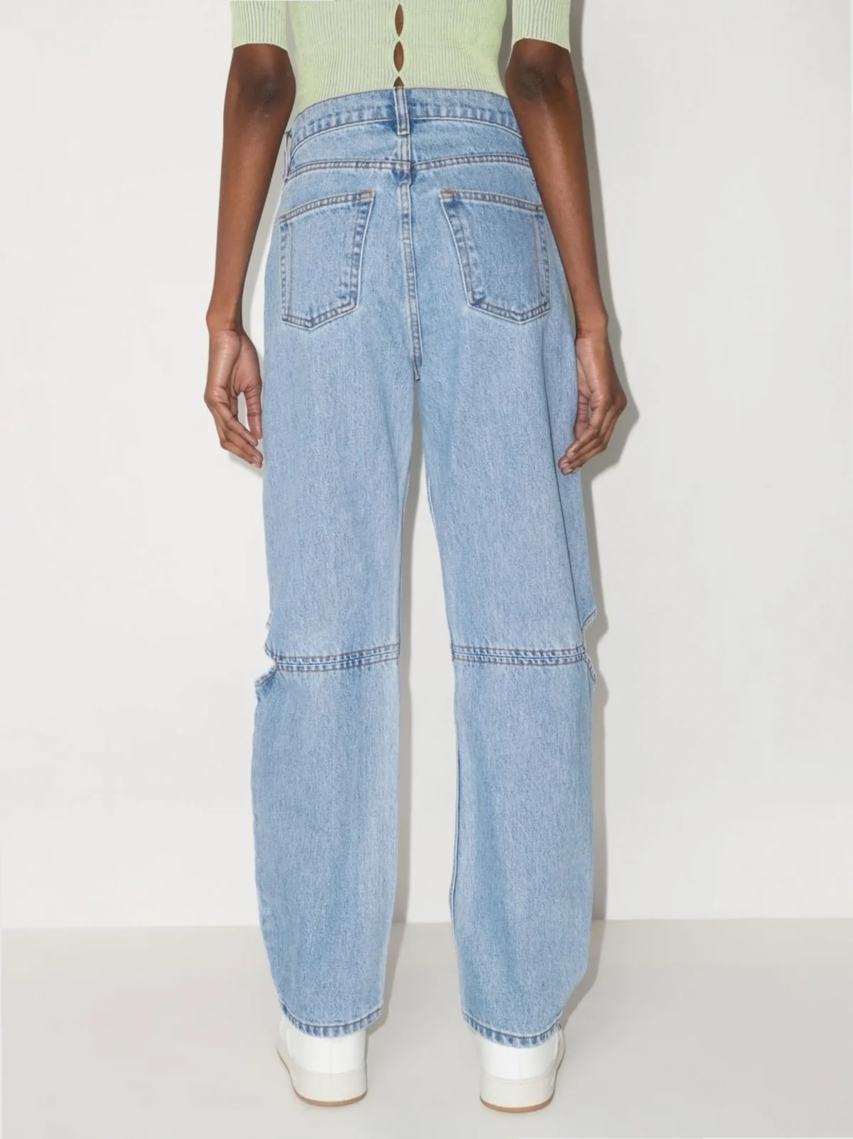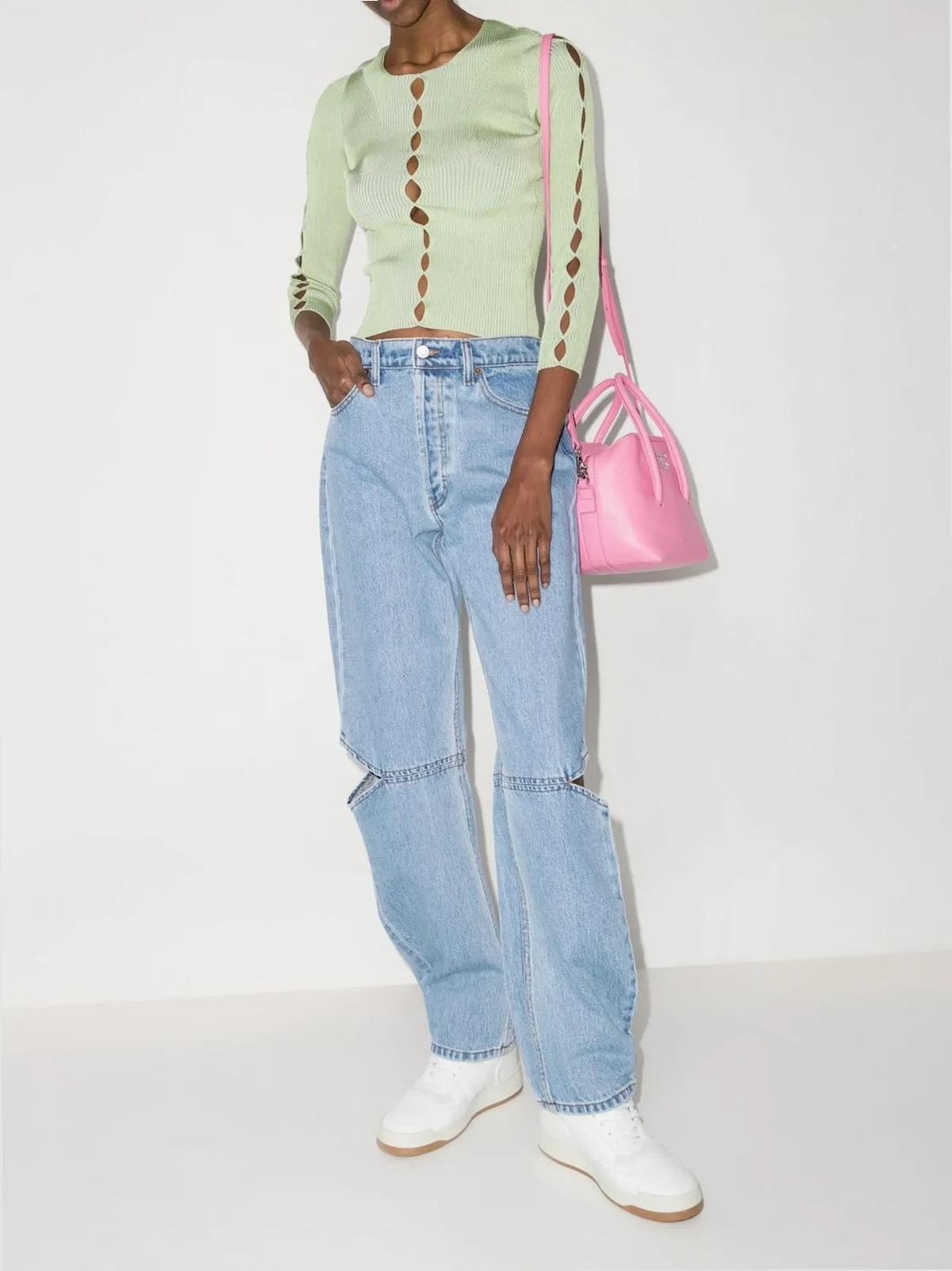 Baumwolle, hohe Taille, gerades Bein, Cut-Outs, Knopf- und Reißverschluss vorne, Gürtelschlaufen, Five-Pocket-Design.