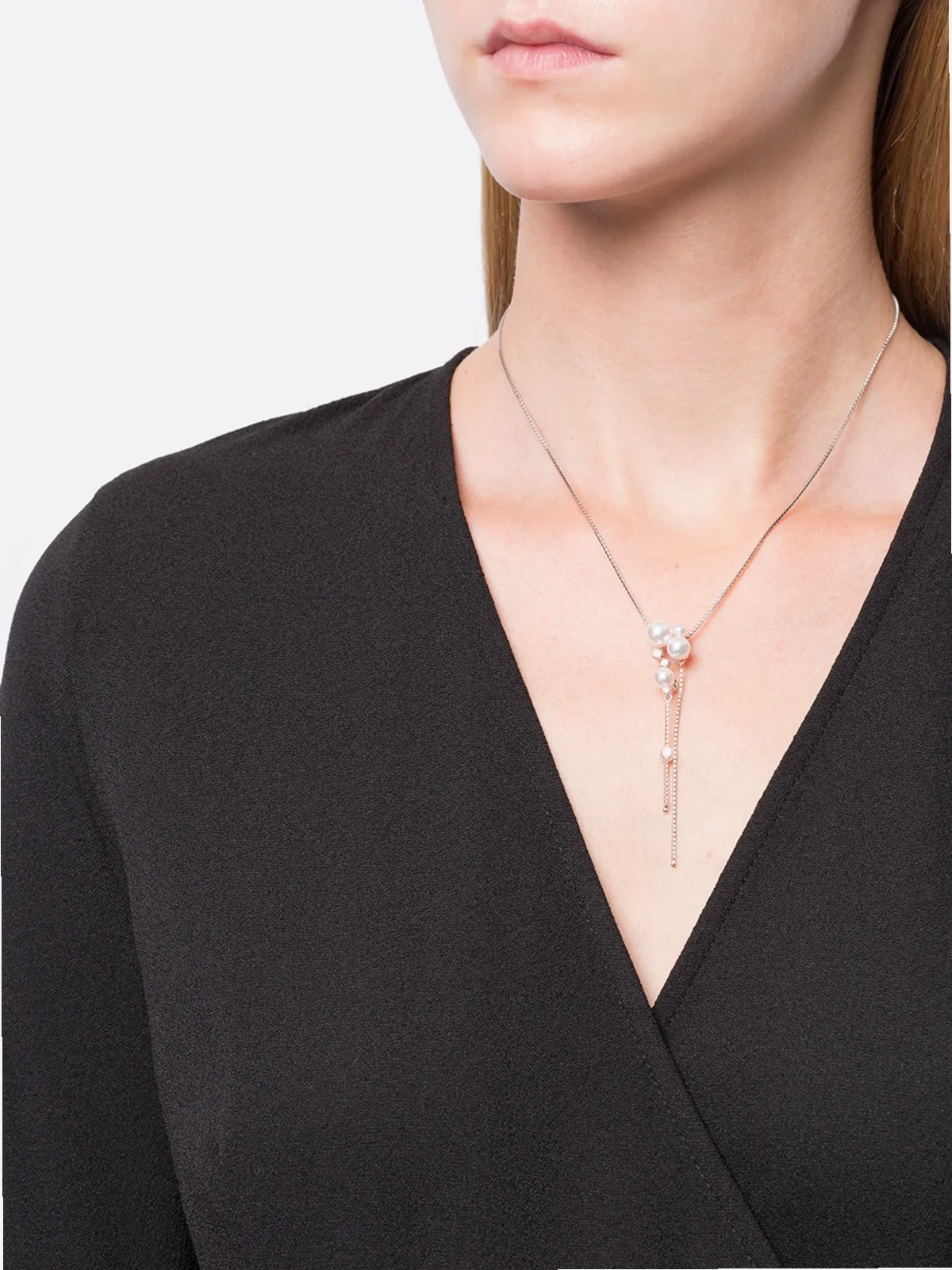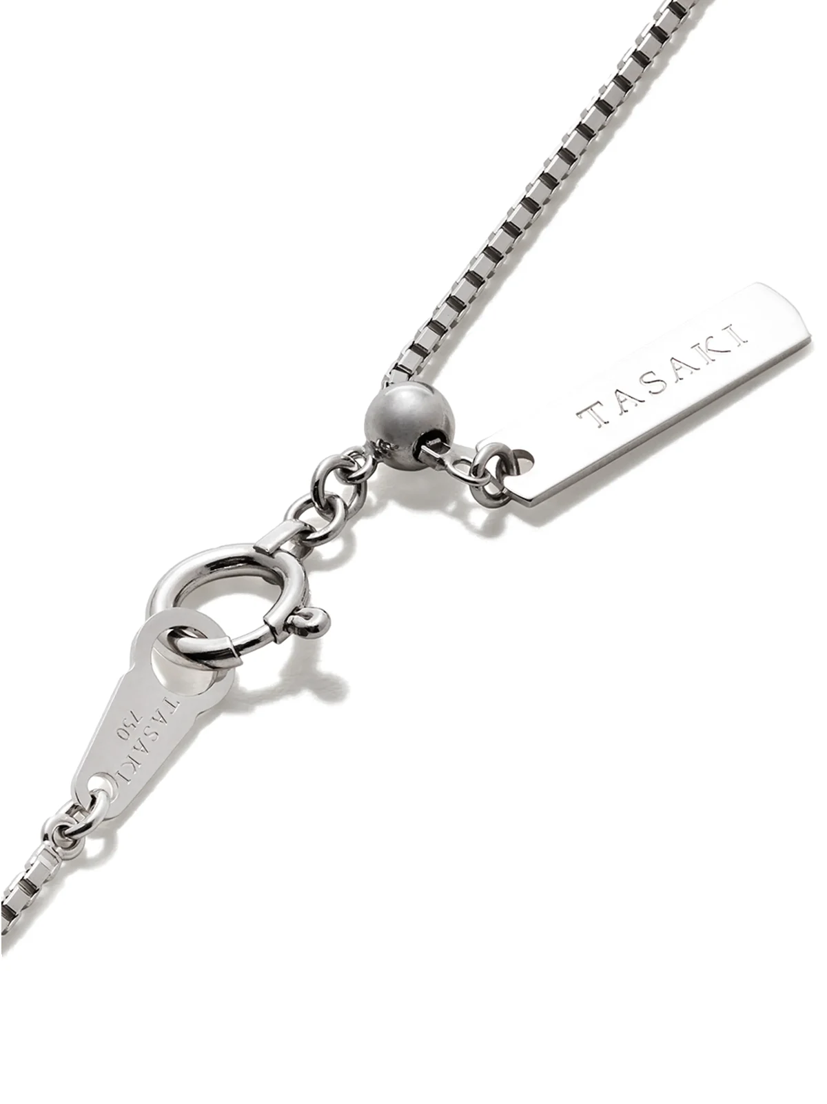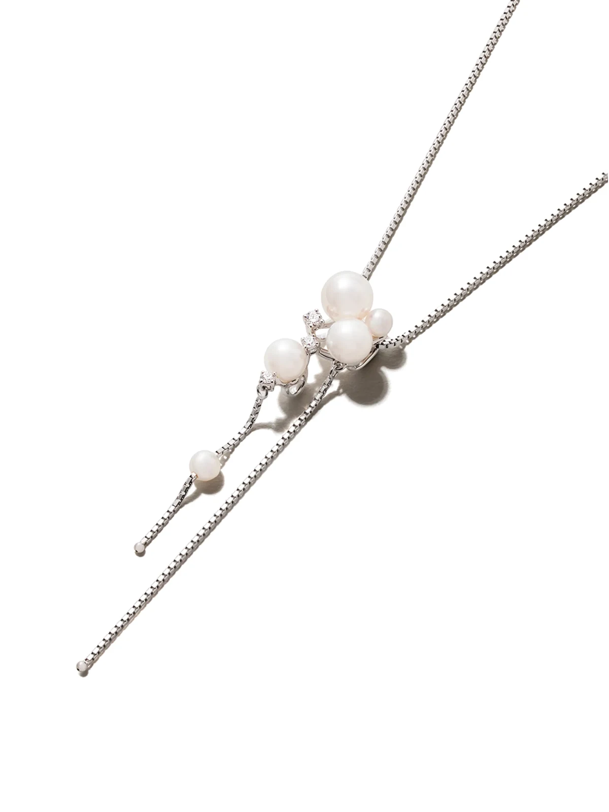 Verziert mit Akoya-Perlen, Diamantenapplikationen, filigrane Kette, Federringverschluss. Für Perlen gilt die Styling-Regel: zuletzt anlegen und zuerst ablegen. Vermeiden Sie den direkten Kontakt mit Parfüms oder Bodylotions und reinigen Sie die Pieces mit einem weichen Tuch, damit sie ihren Glanz behalten.