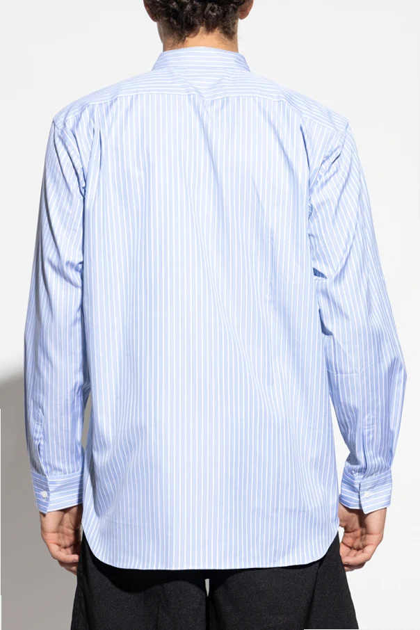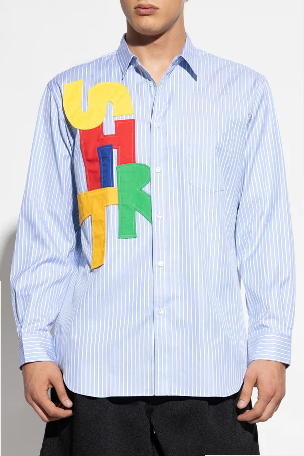 Ein einzigartiges Element ist die Applikation – ein mehrfarbiger, dreidimensionaler Schriftzug auf der Brust, kunstvoll aus aufgenähten Buchstaben gearbeitet, schafft einen dynamischen Akzent und ist das Erkennungszeichen der außergewöhnlichen Linie Comme des Garçons Shirt. Präzise Verarbeitung und die Auswahl der Materialien machen dieses Modell zur Quintessenz der Raffinesse.