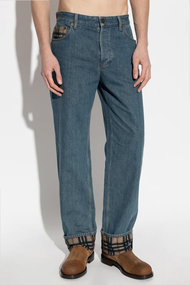 Besonders hervorzuheben sind die sorgfältig gearbeiteten, kontrastierenden Umschläge an den Beinabschlüssen sowie die Fronttasche, die mit dem äußerst bekannten, exklusiven Karomuster veredelt sind – ein Detail, das eindeutig an die erlesensten Designer-Kollektionen erinnert. Abgerundet wird das Gesamtbild durch klassische, hellbraune Nähte und einen dezenten Lederpatch auf der Rückseite – ein subtiler Akzent von Prestige.