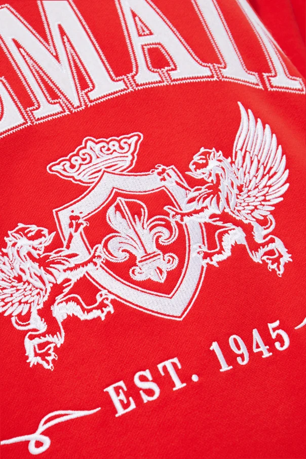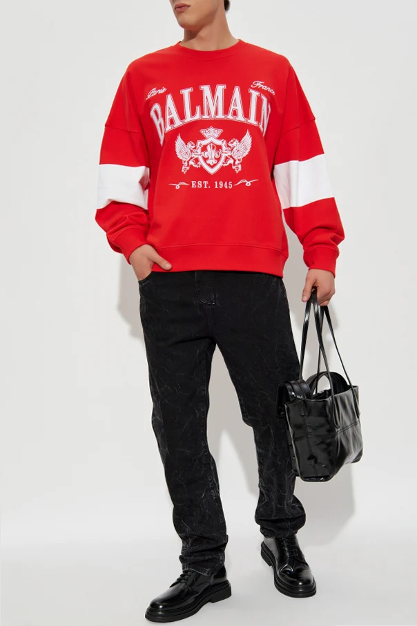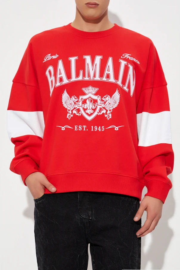 Das Sweatshirt wurde aus hochwertiger, weicher Baumwolle mit glatter, subtiler Struktur gefertigt, die einen hohen Tragekomfort und langanhaltende Haltbarkeit garantiert. Das mittig platzierte, kontrastierende und gestickte „BALMAIN“-Logo, das emblematische Wappen mit Löwe, Greif und Lilie sowie die Aufschrift „EST. 1945“ sind Symbole der reichen Geschichte und des Prestiges des Modehauses. Breite weiße Streifen an den Ärmeln verleihen dem Modell einen einzigartigen, zeitgenössischen Charakter, der den markanten Geist der Kollektion widerspiegelt.