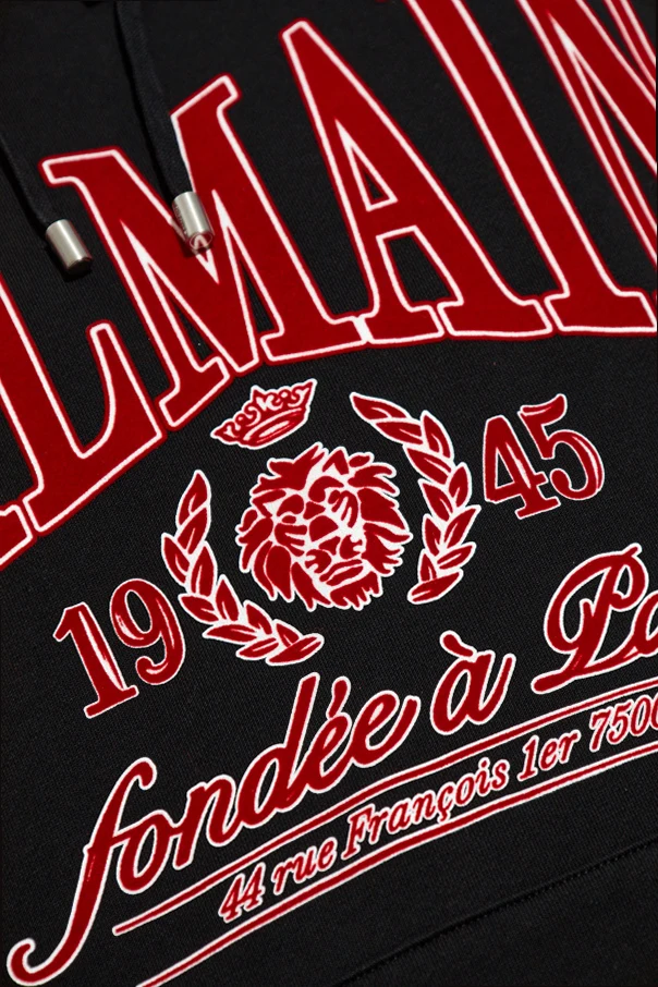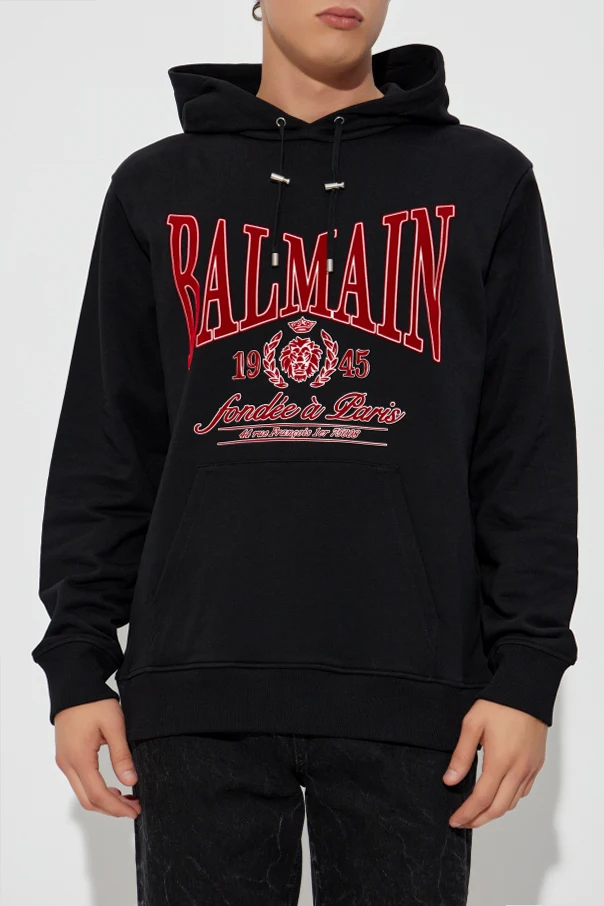 Der lockere, leicht oversized Schnitt mit Kapuze und sorgfältig gearbeiteten Bündchen verleiht der Silhouette eine informelle Eleganz. Das zentrale Detail bildet das markante, rote „BALMAIN“-Logo mit kontrastierender Umrahmung, betont durch das majestätische Löwenemblem, einen Lorbeerkranz sowie raffinierte Schriftzüge, die eine Hommage an das Erbe der Marke darstellen. Die erhabenen Prints mit samtiger Textur verleihen dem Ganzen einen edlen Charakter und unterstreichen die Einzigartigkeit des Sweatshirts.