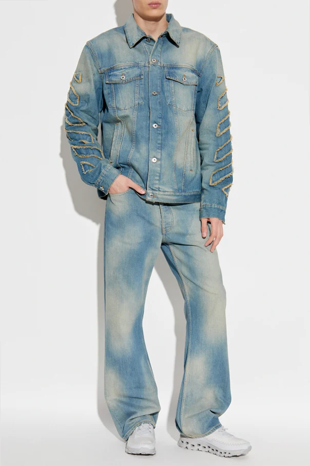 Gefertigt aus hochwertigem Denim mittlerer Stärke im blauen Farbton mit dezenten Aufhellungen, verleiht sie durch Abwetzungen und sorgfältig ausgearbeitete Vintage-Effekte – besonders an den Ärmeln mit originellen Einschnitten und ausgefransten Kanten – einen einzigartigen Charakter. Markante, kontrastierende Nähte in Gelb-Orange ergänzen das Gesamtbild und runden das Design stilvoll ab.