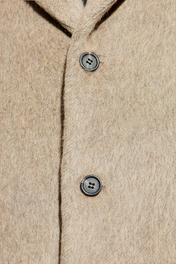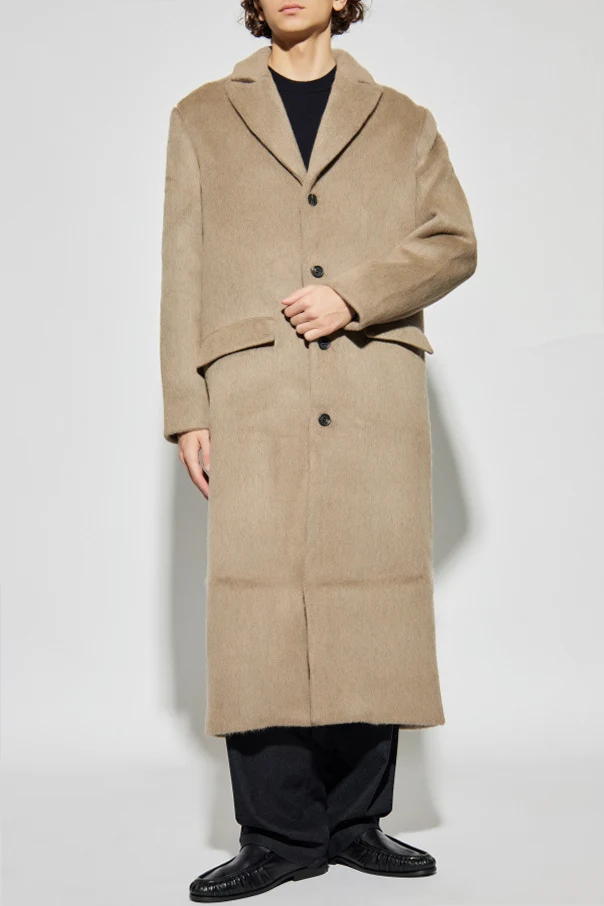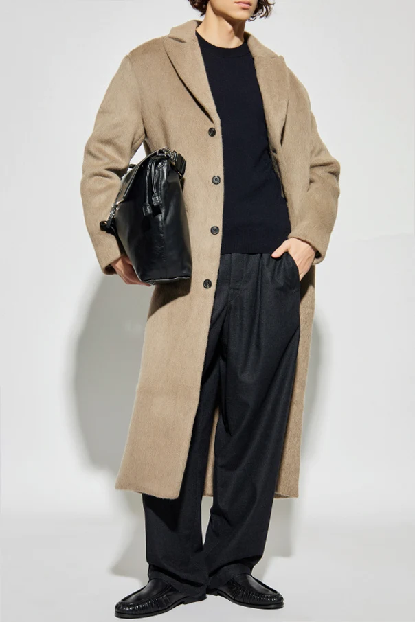 Das edel haarige Material, eine harmonische Mischung aus hochwertiger Wolle und Polyamid, zeichnet sich durch eine voluminöse Struktur und außergewöhnliche Weichheit aus. Die einheitliche, beigefarbene Nuance des Mantels harmoniert perfekt mit der minimalistischen Ästhetik und der formellen Ausstrahlung des Outfits.