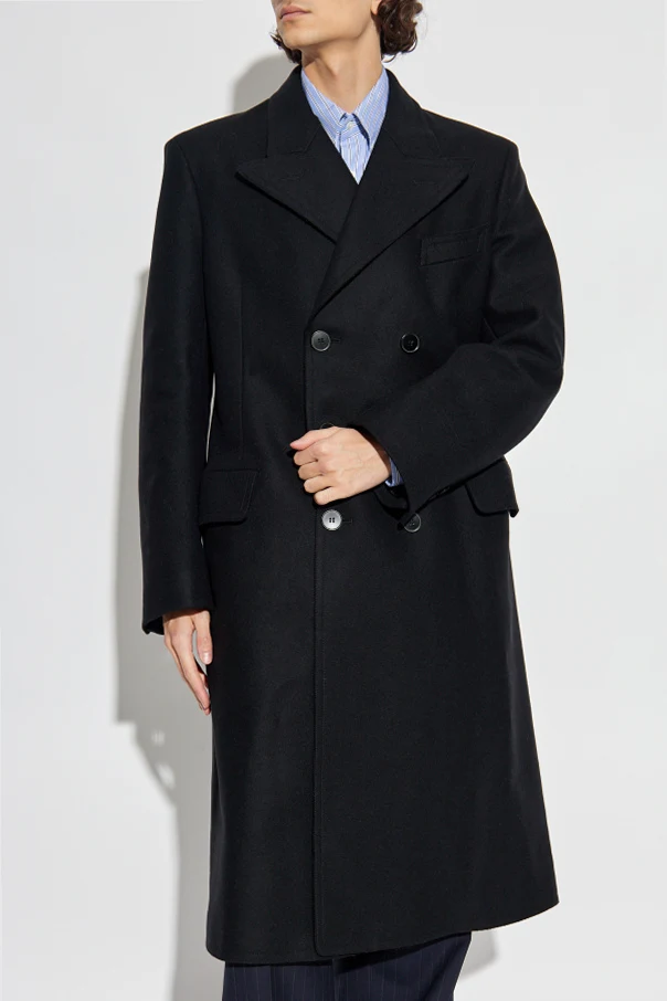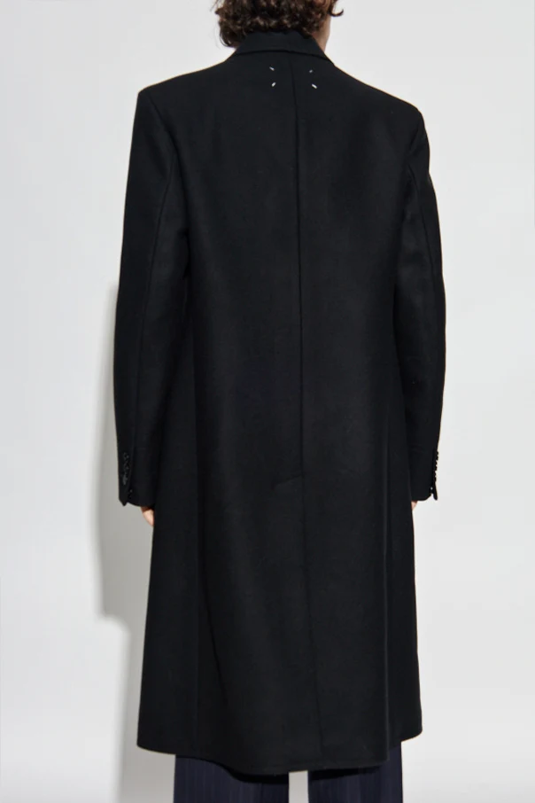 Der Wollmantel des Pariser Modehauses Maison Margiela ist die Quintessenz formeller, maskuliner Eleganz in moderner Ausführung. Der markante Schnitt mit verlängerter Linienführung, einer schlanken, geraden Passform und geometrischen Teilungsnähten besticht durch unaufdringlichen Chic und zeitlose Raffinesse. Der Charakter des Mantels wird durch breite, ausdrucksstarke Revers, doppelt gesetzte schwarze Knöpfe sowie präzise positionierte Pattentaschen und eine edle Brusttasche auf der linken Seite unterstrichen.