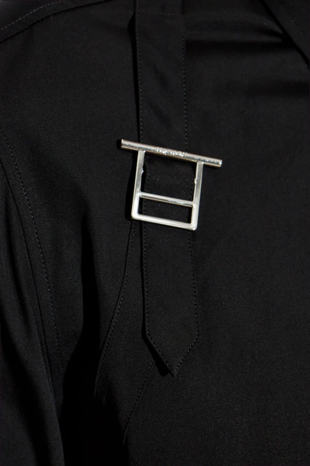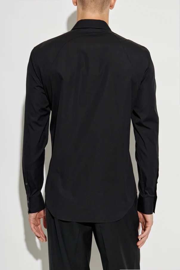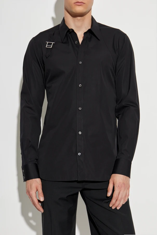 Der einzigartige Charakter wird durch die silberne, geometrische Applikation betont, die direkt an der linken Schulter angebracht ist – ein Detail mit kunstvoll graviertem Logo des Designers Alexander McQueen, das zugleich ein Statement für handwerkliches Können und zeitgenössische Avantgarde ist. Die asketische Form des Produkts, kombiniert mit diesem markanten Akzent, macht das Hemd zur Wahl für all jene, die eine ausgewogene Extravaganz zu schätzen wissen.