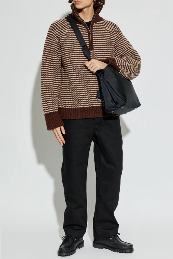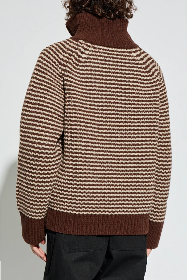Der hohe, gerippte Turtleneck mit praktischem Reißverschluss sowie sorgfältig gearbeitete Bündchen in einheitlichem Dunkelbraun vollenden das Gesamtbild und unterstreichen den einzigartigen Charakter dieses edlen Pullovers.