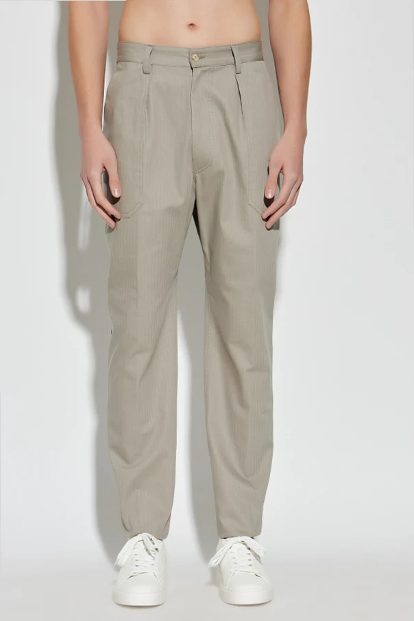 Der klassische, leicht zulaufende Schnitt mit hohem Bund und sorgfältig platzierten Abnähern sorgt für einen außergewöhnlichen Auftritt und optimale Bewegungsfreiheit. Große, aufgesetzte Taschen vorne und hinten verbinden Extravaganz mit Funktionalität und verleihen der Hose einen markanten, lässigen Charakter. Stilvoller Knopfverschluss und Reißverschluss runden das Gesamtbild ab.