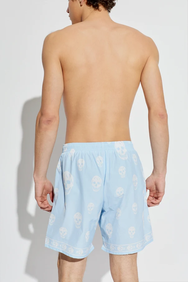 Bade-Shorts mit Totenkopf-Motiv vom herausragenden Designer Alexander McQueen strahlen lässige Eleganz und Mut zum Ausdruck aus. Der klassische, lockere Schnitt bis zur Mitte des Oberschenkels betont den Tragekomfort perfekt, während der elastische Bund eine ideale Anpassung an die Silhouette gewährleistet. Das gesamte Modell besteht aus hochwertigem Polyamid, was für Leichtigkeit sowie eine besonders schnelle Trocknung sorgt – besonders geschätzt bei sommerlichen Aktivitäten.
