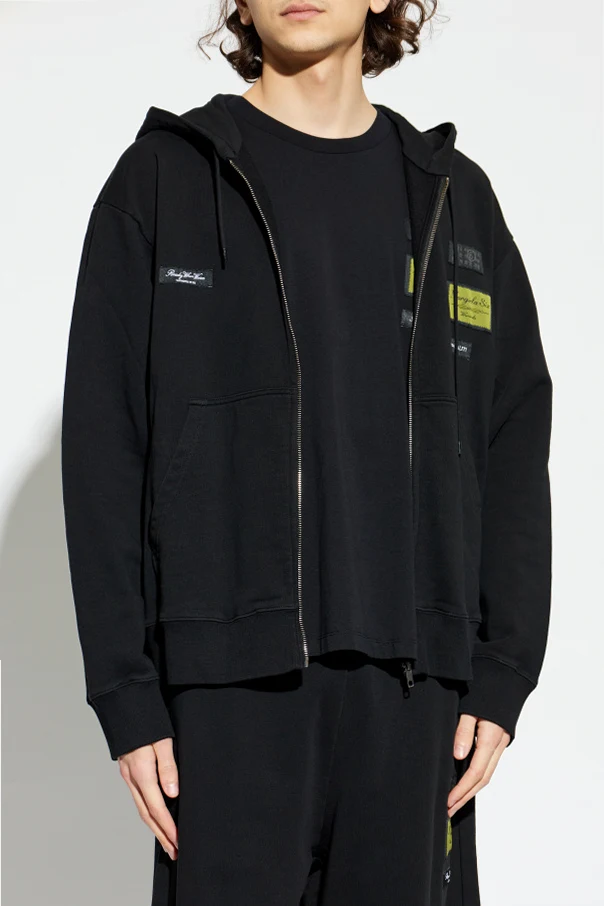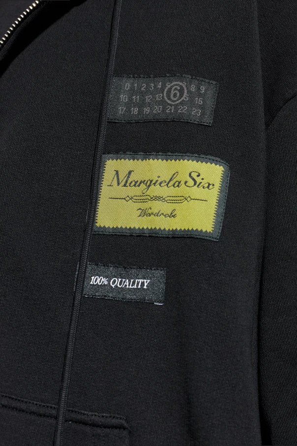 Der Zip-up Schnitt mit Kapuze und Reißverschluss sorgt dafür, dass das Sweatshirt sich perfekt an die Silhouette anpasst und ihren modernen Charakter unterstreicht. Die Essenz des Produkts bilden die auffälligen Aufnäher – ein markantes schwarzes Patch mit weißer Ziffer „6“, das gelb-goldene „Margiela Six“ sowie der inspirierende Schriftzug „100% QUALITY“. Sie sind ein Beweis für das konzeptionelle Erbe der Marke.